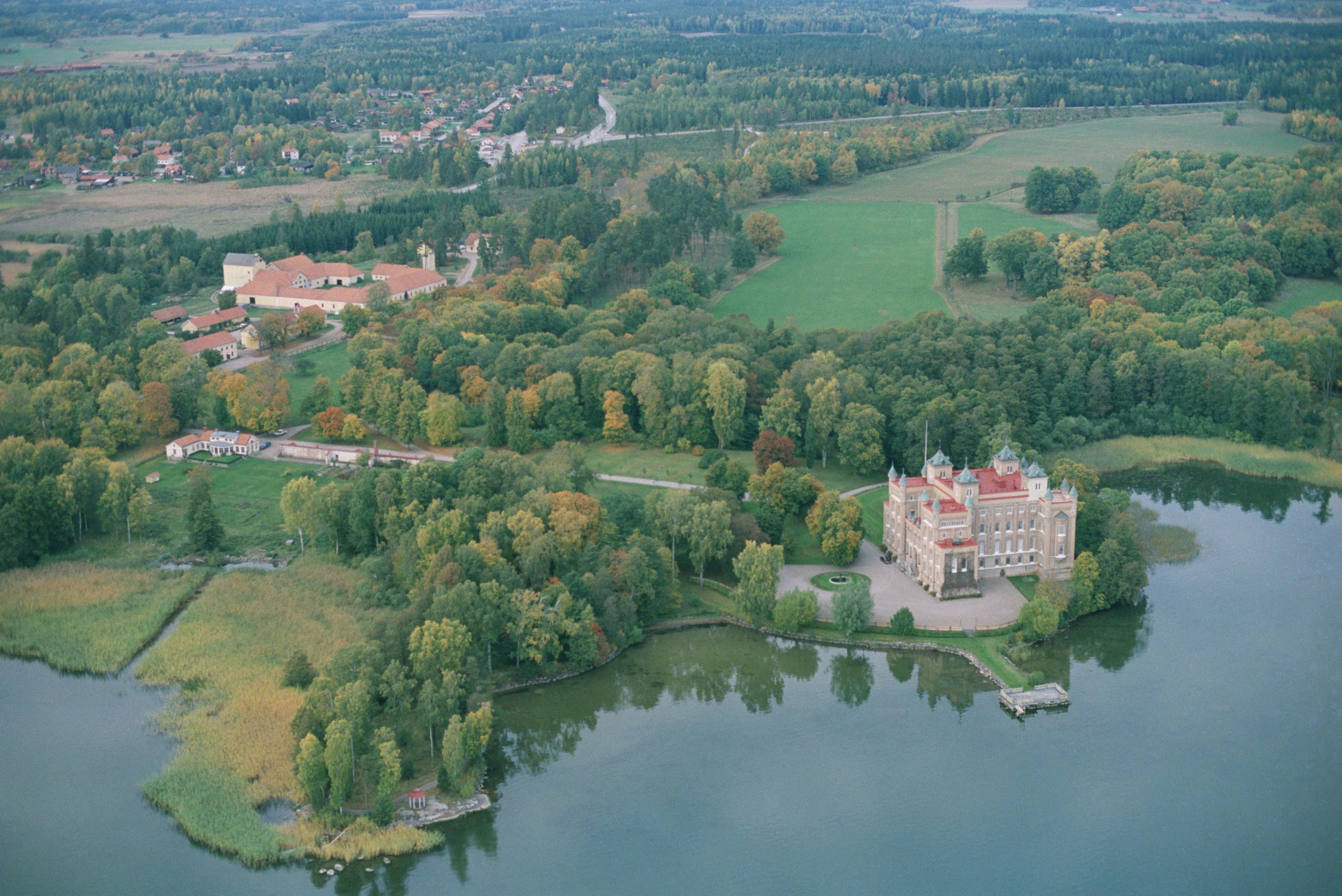 Beskrivning: Stora Sundby slott, byggnadsminne RAÄnr Öja 58:1, vid Slottsviken i nordöstra delen av sjön Hjälmaren. I bildens övre del Alberga tätort vid gränsen mot Västermo socken. Bilden är tagen mot (väderstreck): N