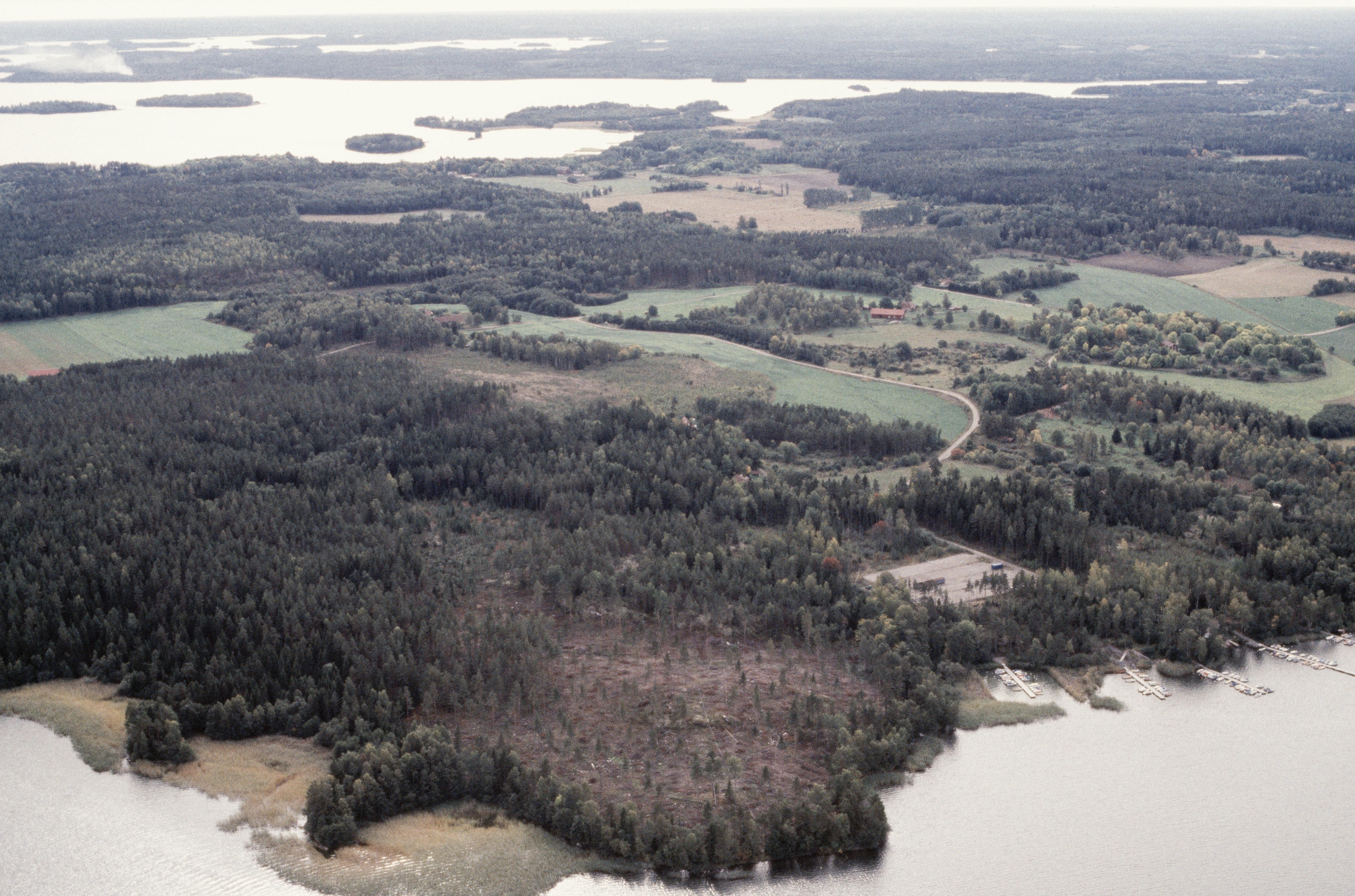 Beskrivning: Näsbyviken / Ringsösundet i Mälaren. I bildens nedre del Ropudden med stensättningar, bl.a. RAÄnr Ytterselö 105:1-3. Näsby tegelbruk vid bildens mitt. I bildens övre del området vid Mälsåkers slott. Bilden är tagen mot (väderstreck): S