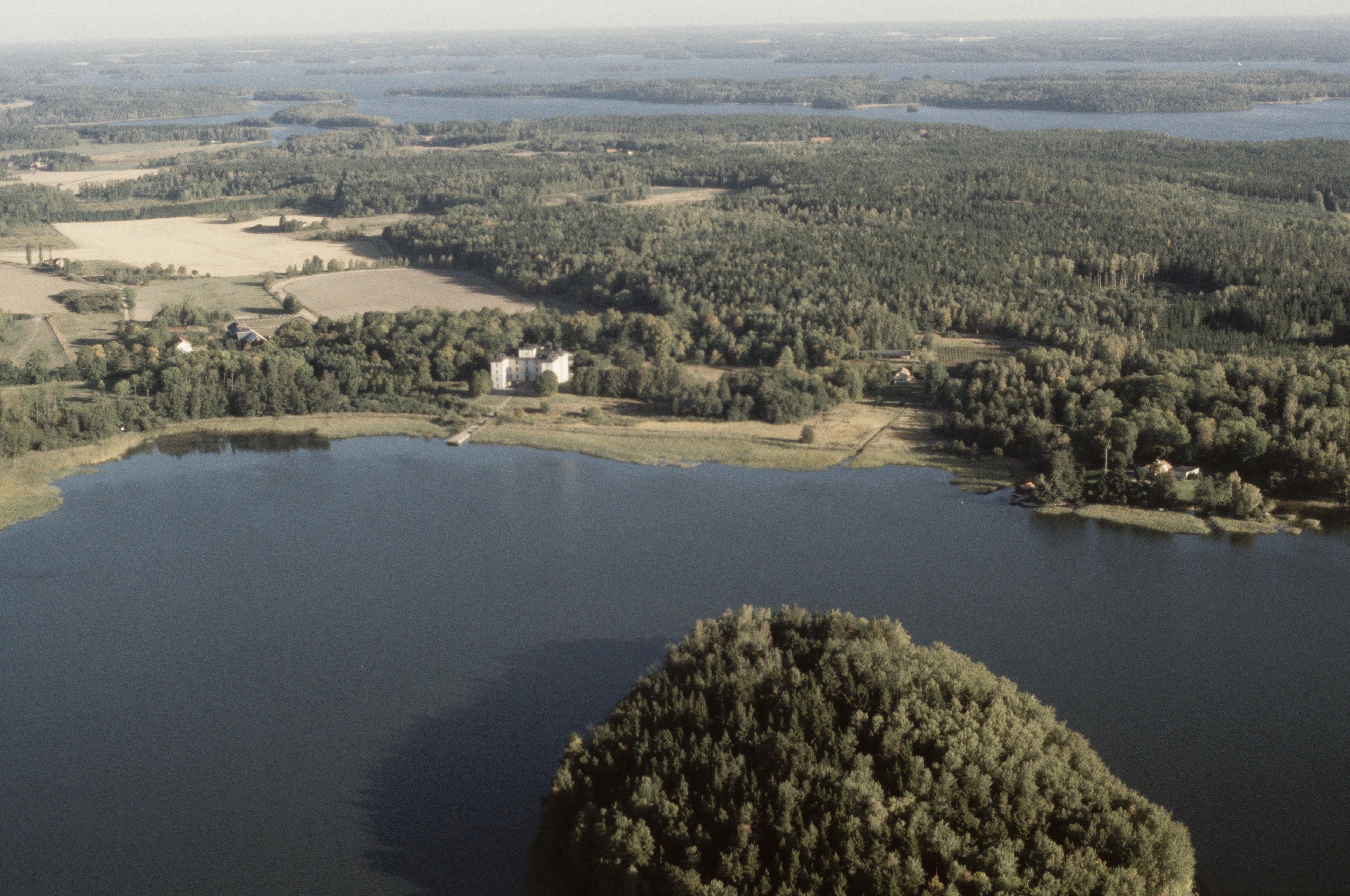 Beskrivning: Mälsåkers slott RAÄnr Ytterselö 122:1 på Selaön vid Prästfjärden i Mälaren. Gåsholmen nere till höger. Bilden är tagen mot (väderstreck): N