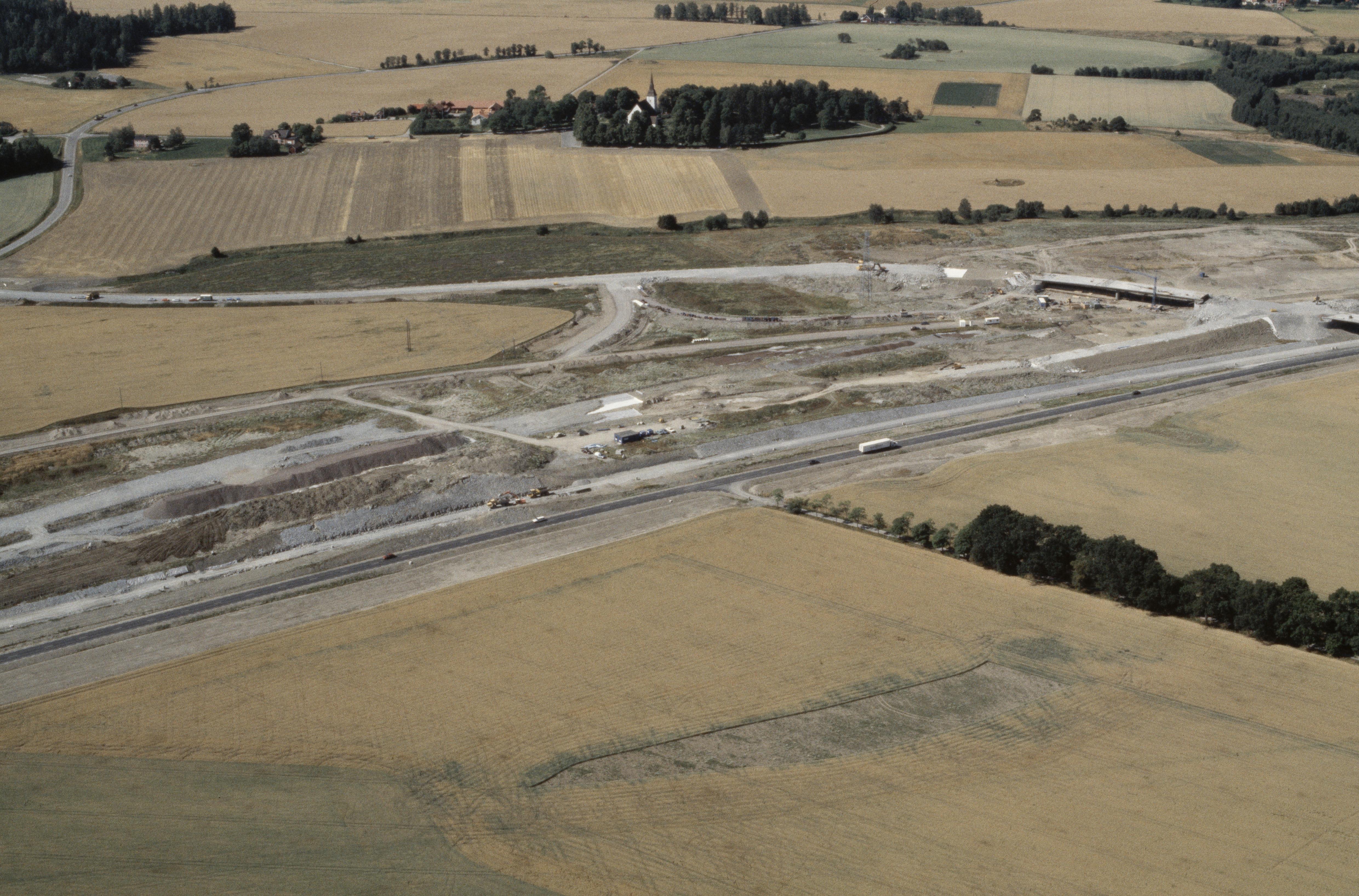 Beskrivning: Arkeologisk undersökning innan bygge av väg E20 norrost om Åkers kyrka (i bildens övre del) och Löta å. Grav- och boplatser RAÄnr Åker 271:1-2, 268:1, 282:1, 283:1, m.fl. vid bildens mitt. Bilden är tagen mot (väderstreck): V