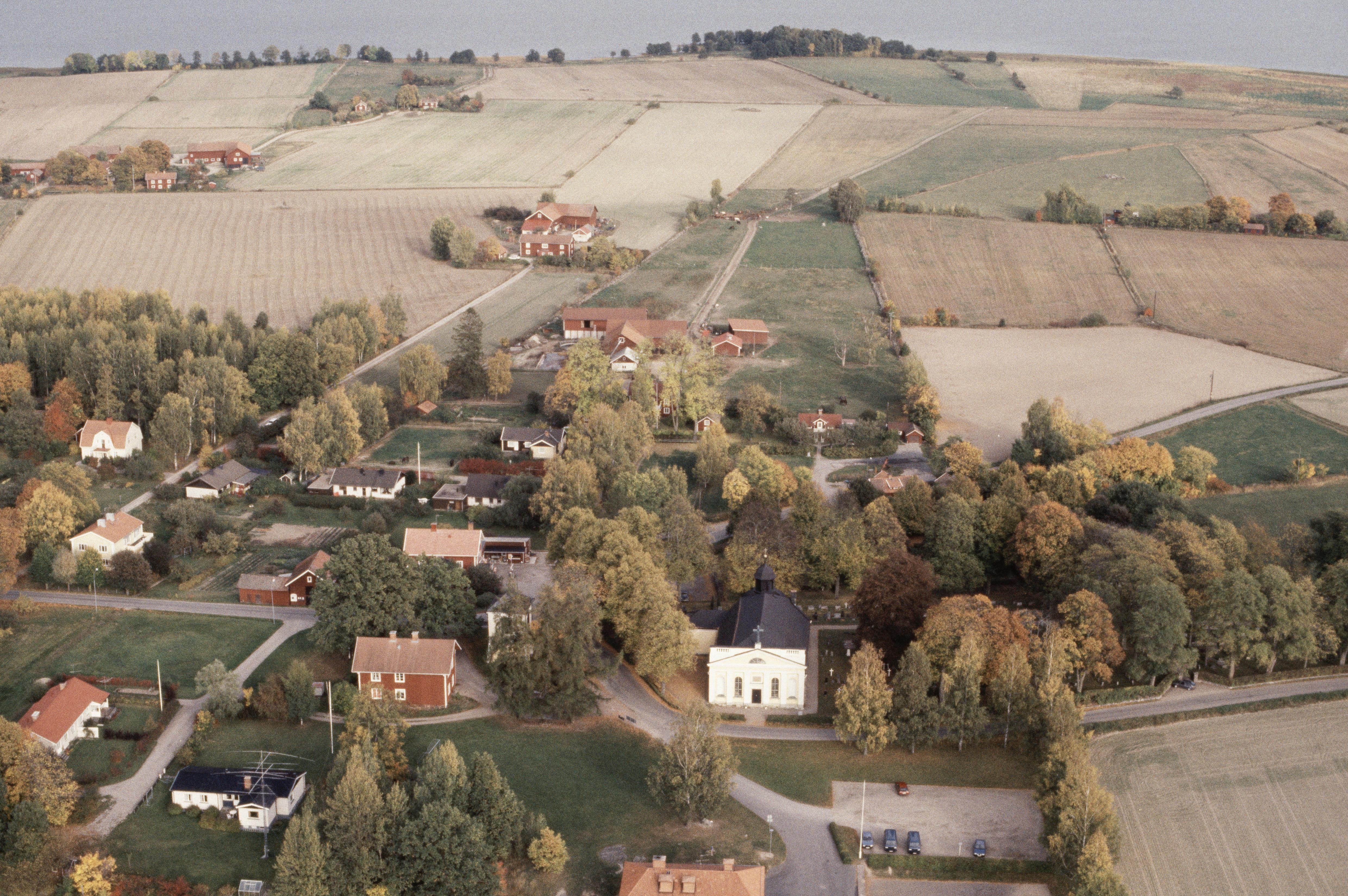 Beskrivning: Österåkers kyrka och kyrkby vid sjön Öljaren. Bilden är tagen mot (väderstreck): Ö