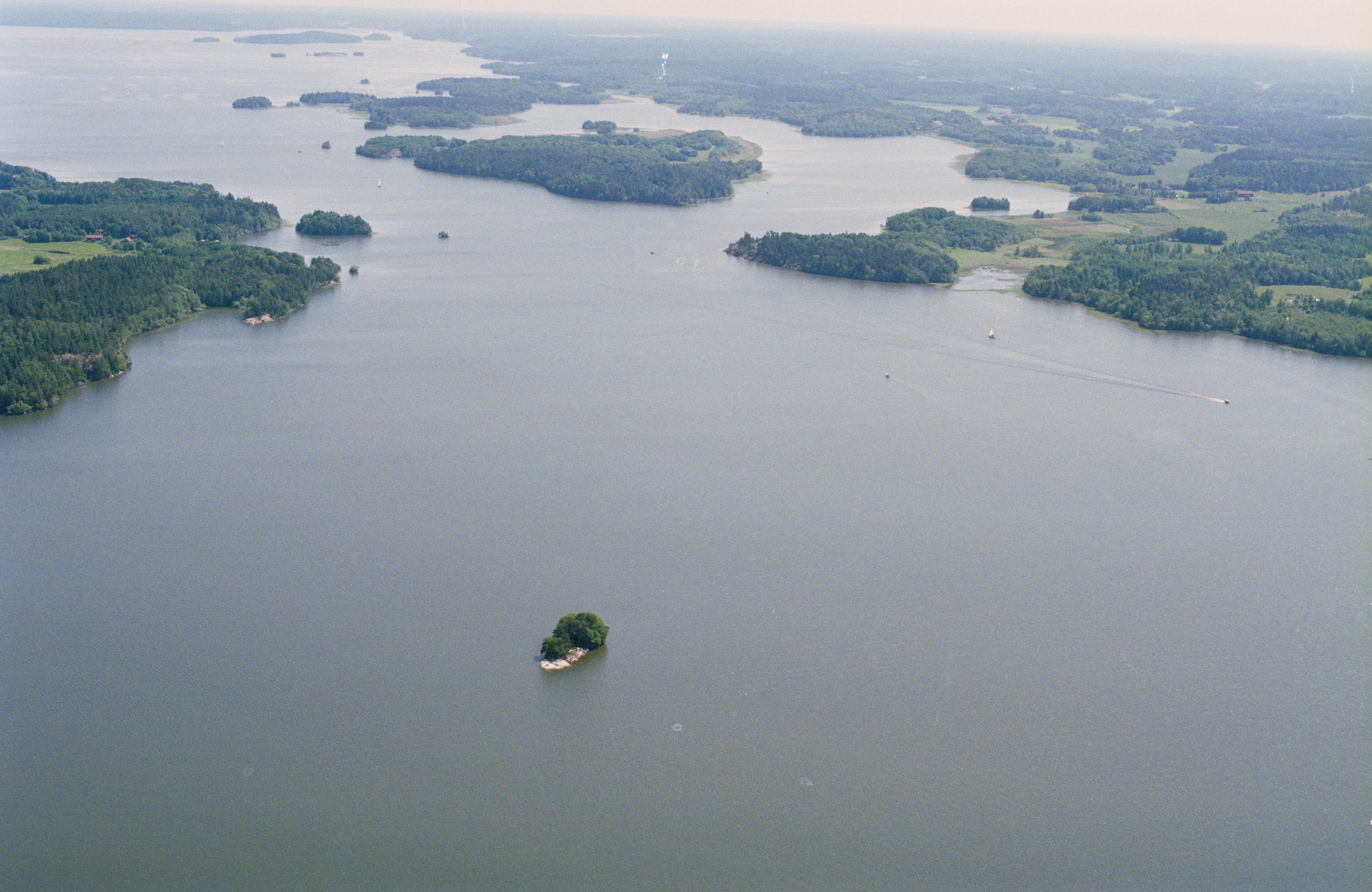 Beskrivning: Mälaren. I bildens nedre del holmen Munken i farleden mot Överenhörna. Till höger över bildens mitt Eksholmen i Hornboviken med stensättning RAÄnr Överenhörna 9:1. Uppe till höger Horns herrgård. Bilden är tagen mot (väderstreck): SO