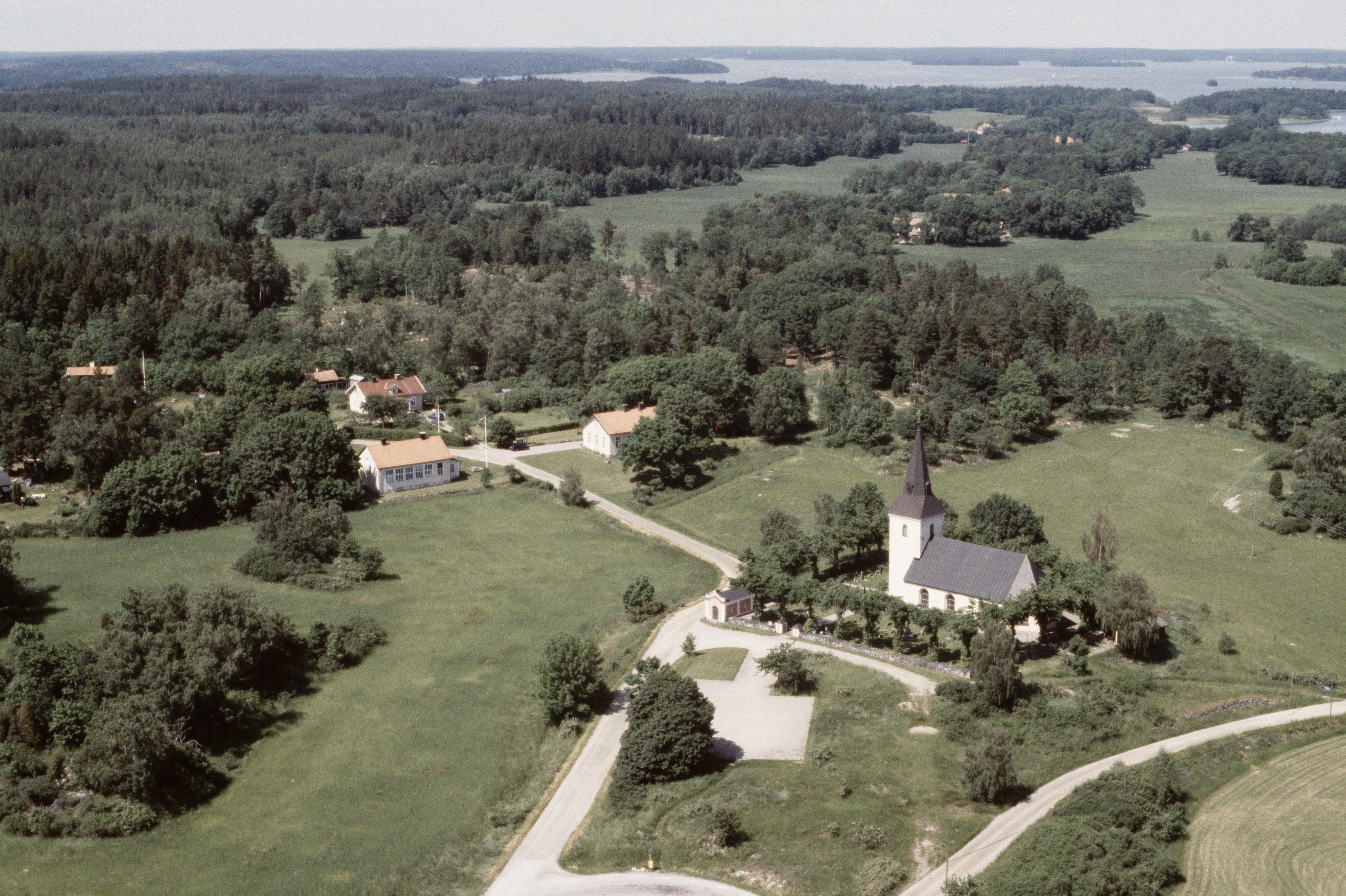 Beskrivning: Överenhörna kyrka och hembygdsgård. Till höger över bildens mitt fornlämningsområde / bytomt Husby backe RAÄnr Överenhörna 61:1-4. I bildens övre del Hornboviken i Mälaren. Bilden är tagen mot (väderstreck): VNV