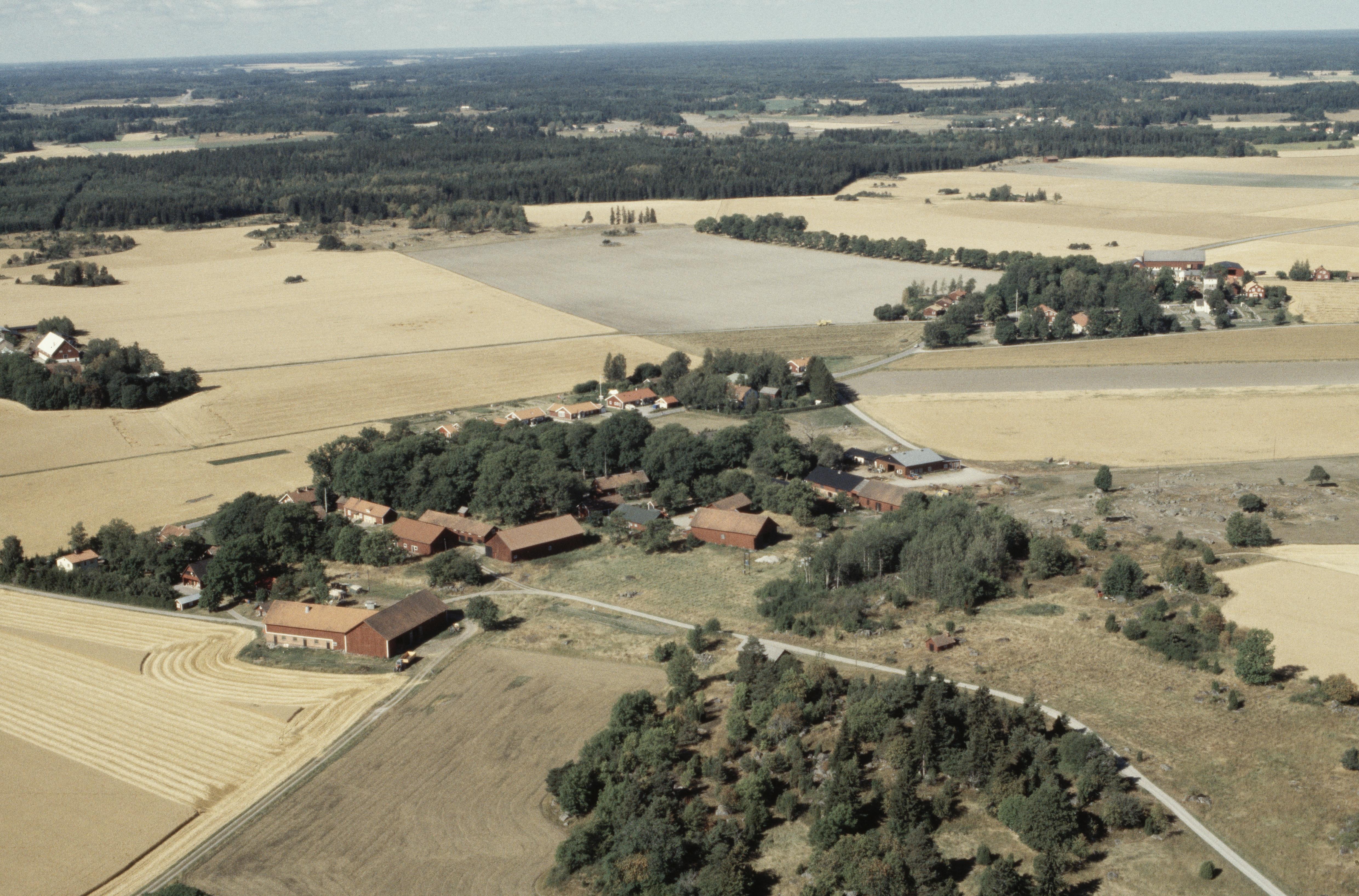 Beskrivning: Balingstaby. Under bildens mitt gravfält RAÄ Balingsta 11:1. Balingsta kyrka och kyrkby uppe till höger. Bilden är tagen mot (väderstreck): VSV