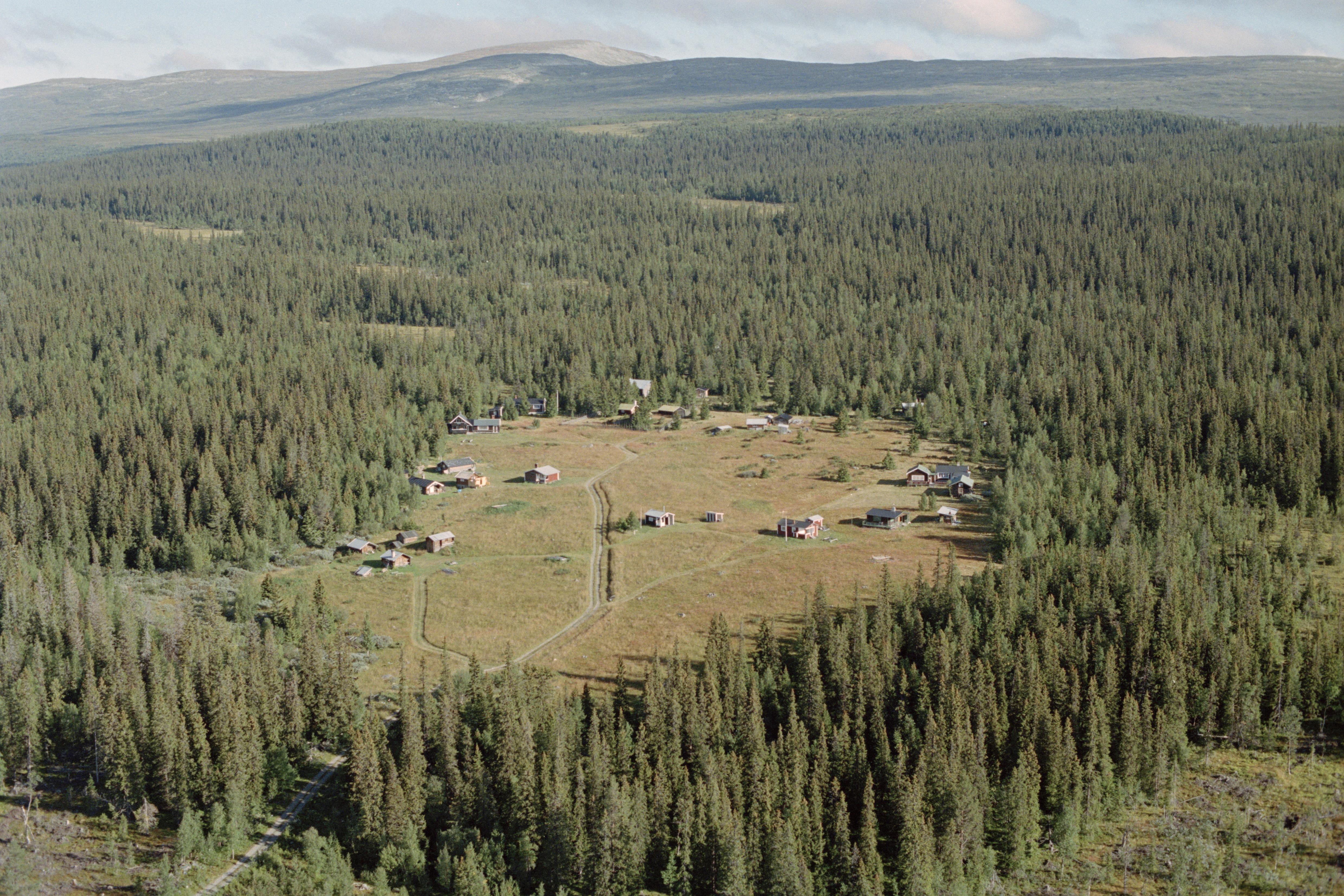 Beskrivning: Prästbodarna i Ovikfjällens fäbodområde vid Stuguberget i södra delen av Arådalens naturreservat. Fäbodområdet Öster-Arådal i skogen över bildens mitt. Fjällen Lillfjället (Biejjhbielie) och Hundshögen (Vinhtseåelkie) i bildens övre kant. Bilden är tagen mot (väderstreck): N