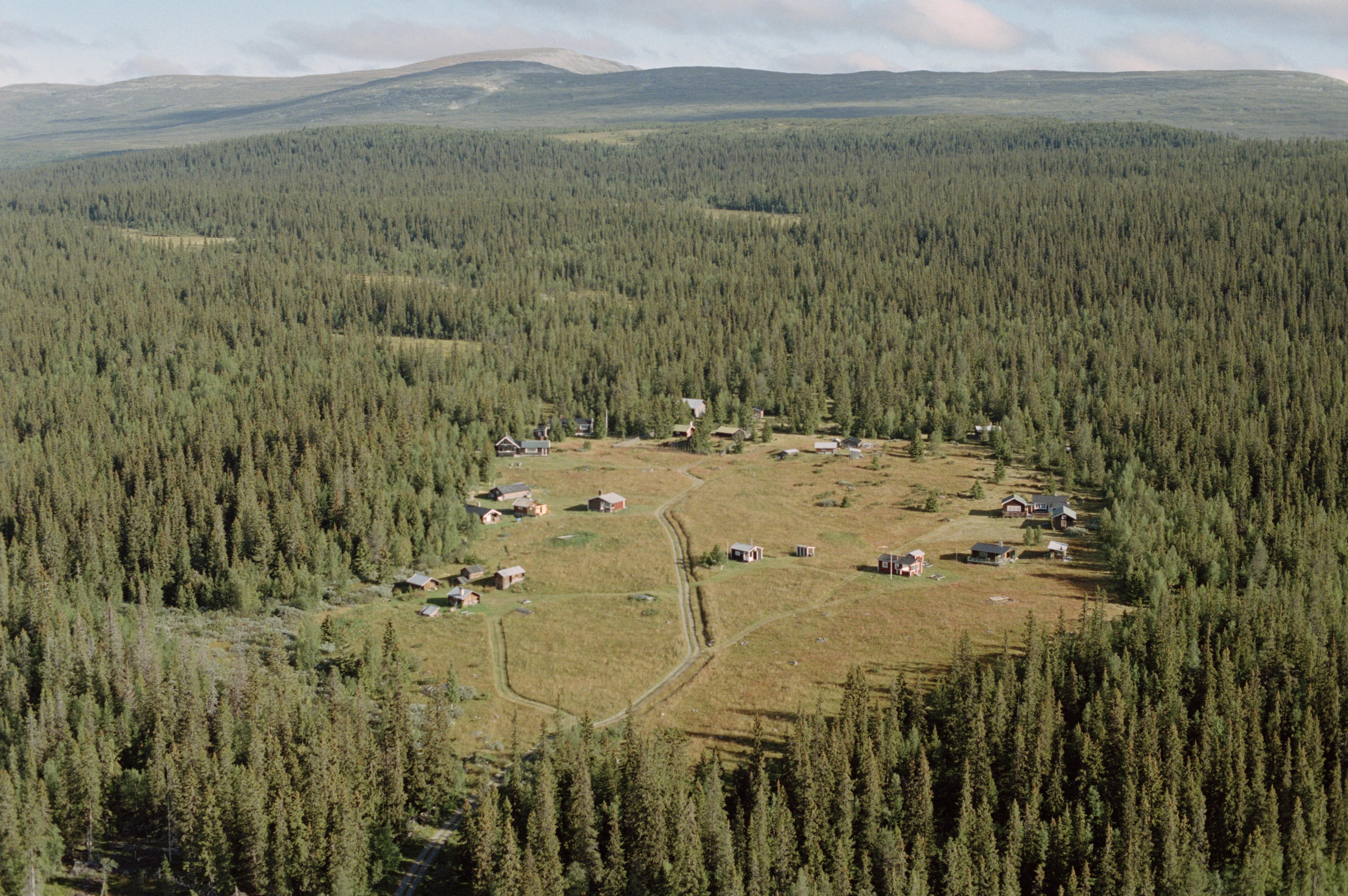 Beskrivning: Prästbodarna i Ovikfjällens fäbodområde vid Stuguberget i södra delen av Arådalens naturreservat. Fäbodområdet Öster-Arådal i skogen över bildens mitt. Fjällen Lillfjället (Biejjhbielie) och Hundshögen (Vinhtseåelkie) i bildens övre kant. Bilden är tagen mot (väderstreck): N