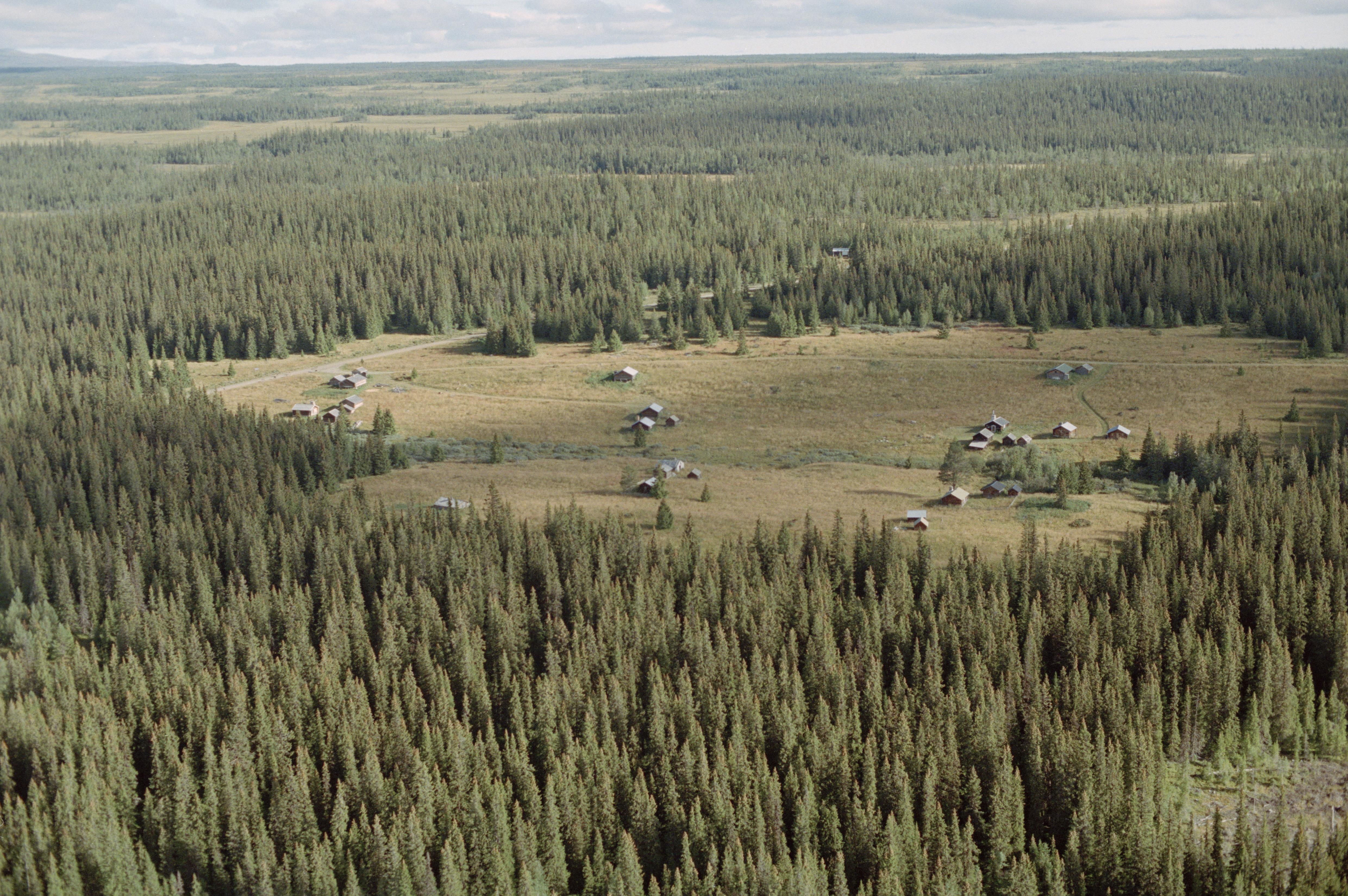 Beskrivning: Svedjebodarna i Ovikfjällens fäbodområde. Svedjebodbäcken rinner genom fäbodsbyn. Långbodåsen över bildens mitt. Bilden är tagen mot (väderstreck): NO
