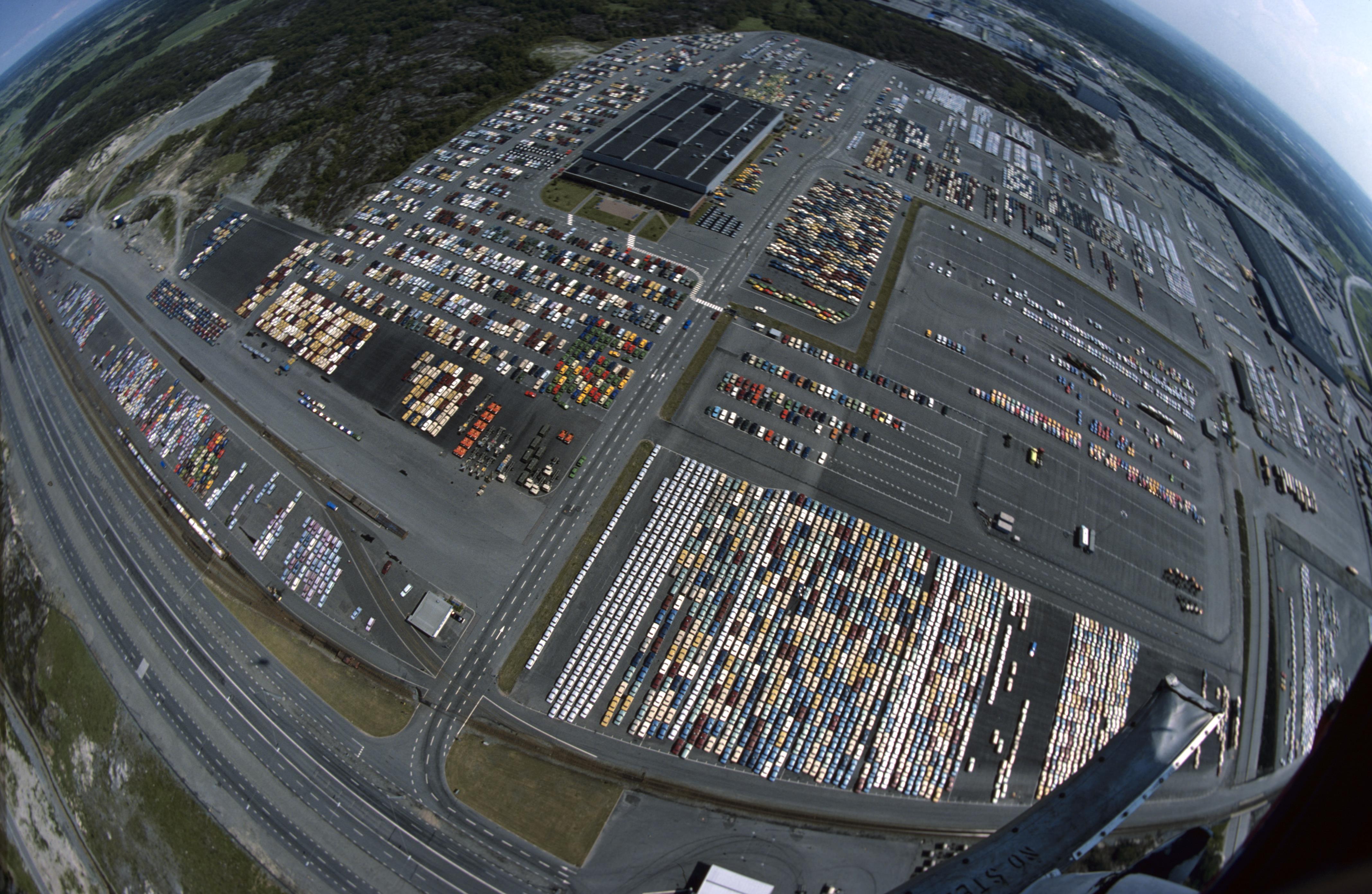 Flygbild av fabriken och parkeringarna för nya fordon.