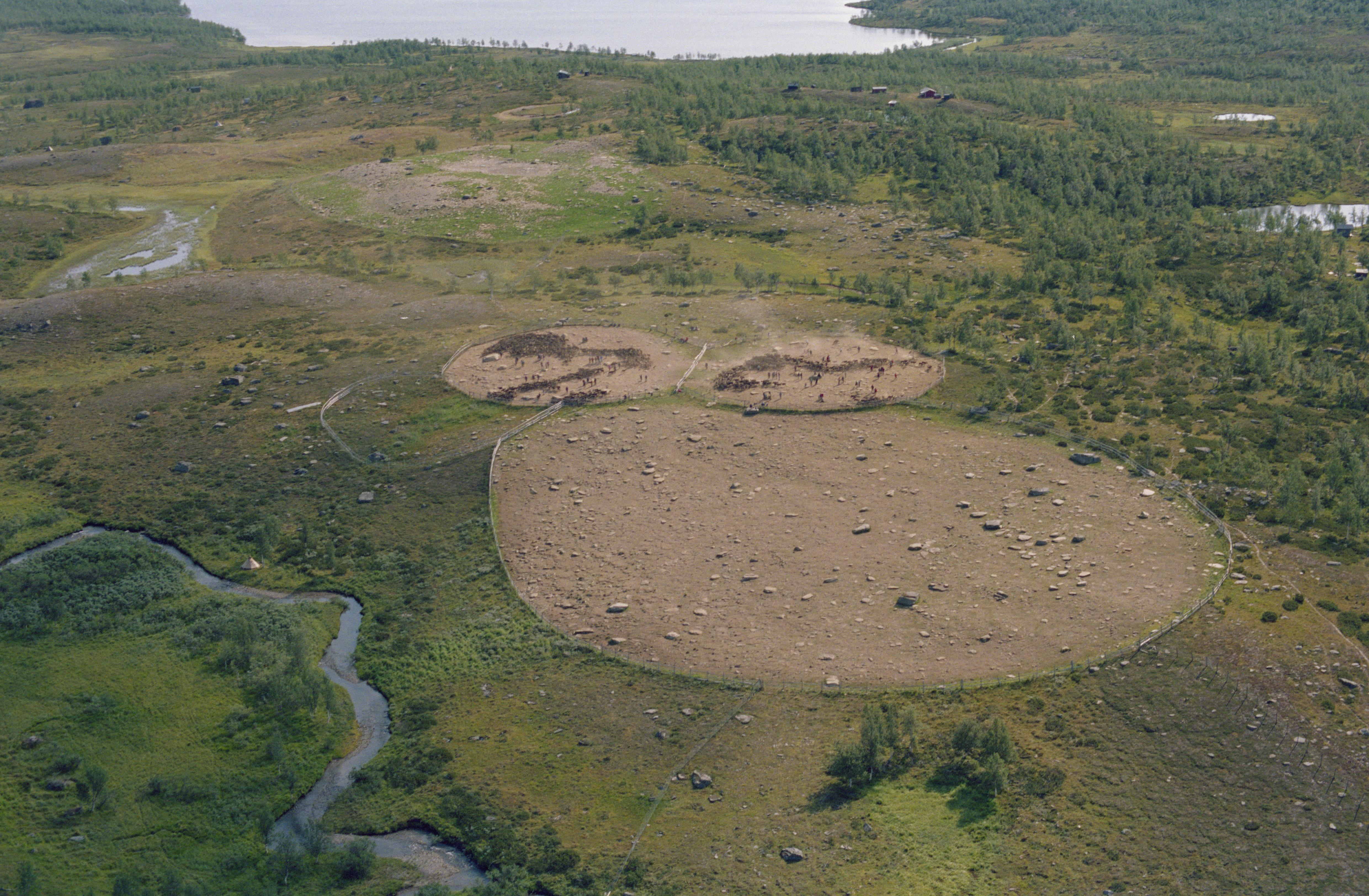 Beskrivning: Rengärden med renskiljning (rarkning) i samevistet Parka (Bárkka). På sydsidan av rengärden ett fångstgropssystem RAÄnr Arjeplog 327:1. Bilden är tagen mot (väderstreck): Ö