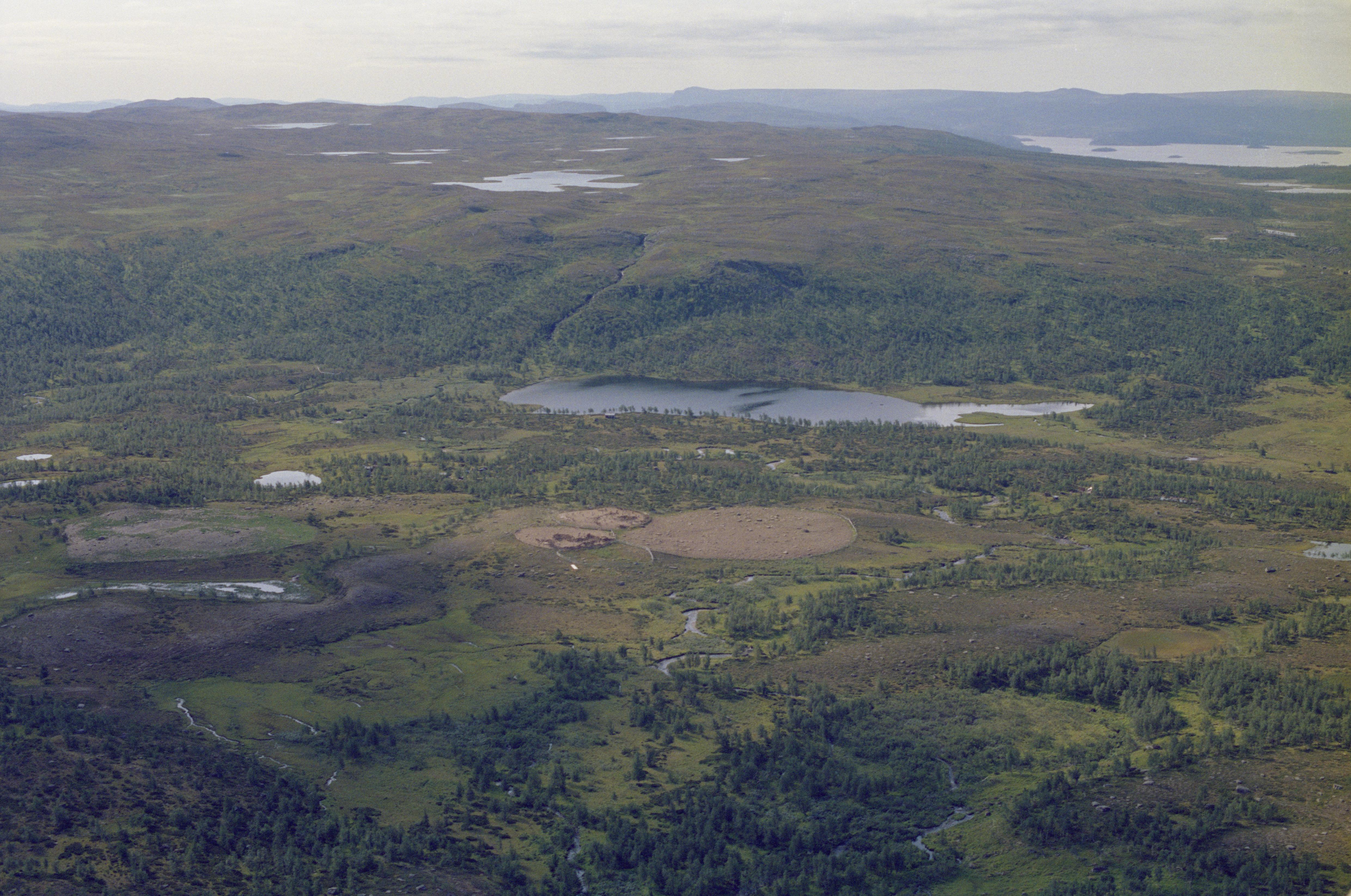 Beskrivning: Samevistet Parka (Bárkka). Rengärden vid bildens mitt. Över bildens mitt fångstgropssystem RAÄnr Arjeplog 327:1 vid sjön Unna Parkajaure (Unna Bárkájávrre). Gränsen mot socknet Jokkmokk går längs bildens vänstra kant. Bilden är tagen mot (väderstreck): S