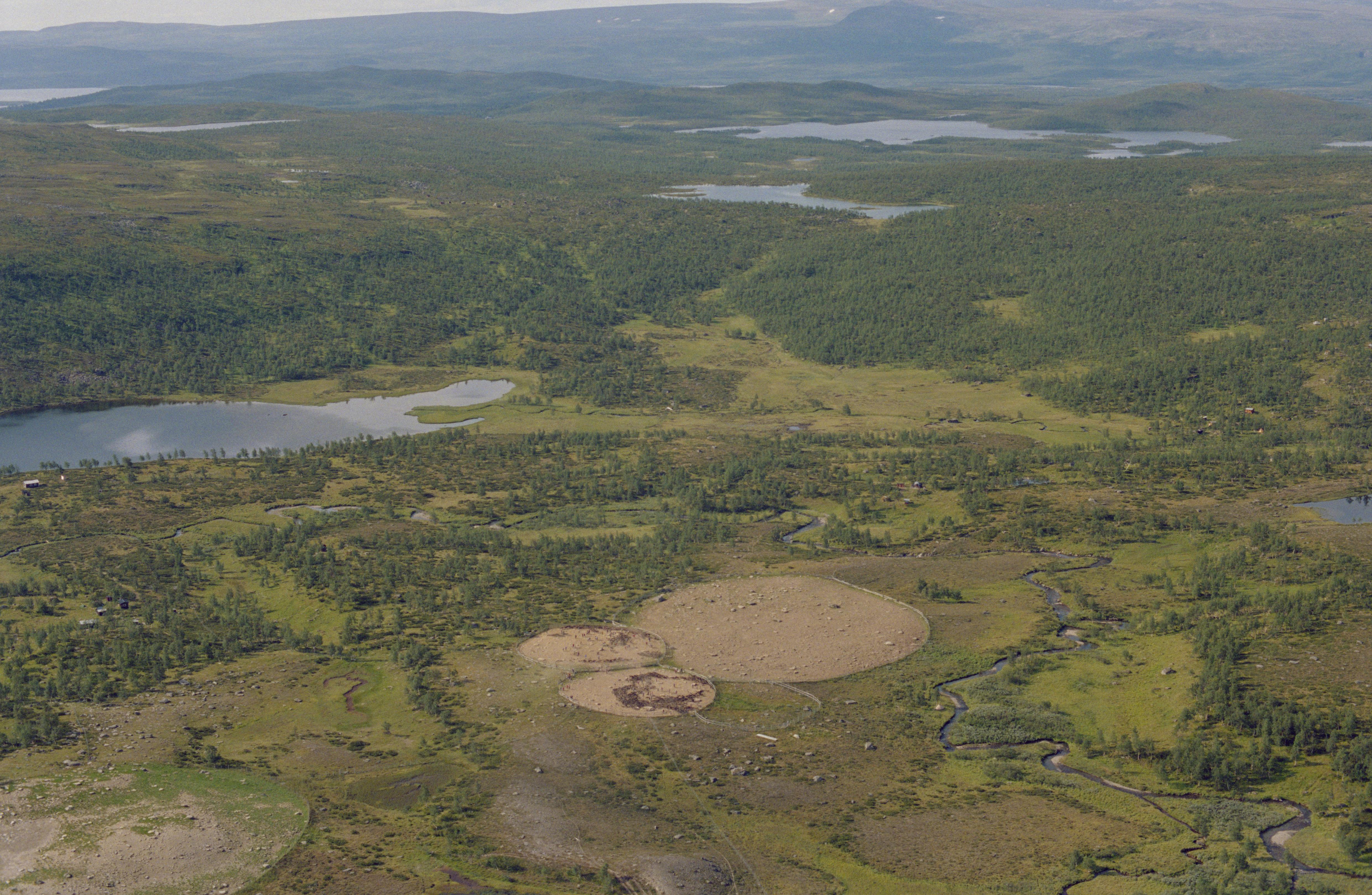 Beskrivning: Samevistet Parka (Bárkka). I bildens vänstra del sjön Unna Parkajaure (Unna Bárkájávrre) och fångstgropssystem RAÄnr Arjeplog 327:1. Under bildens mitt rengärden med renskiljning (rarkning). Uppe till höger sjöarna Jiervajávrátj och Sáddermjávrre. Bilden är tagen mot (väderstreck): SV