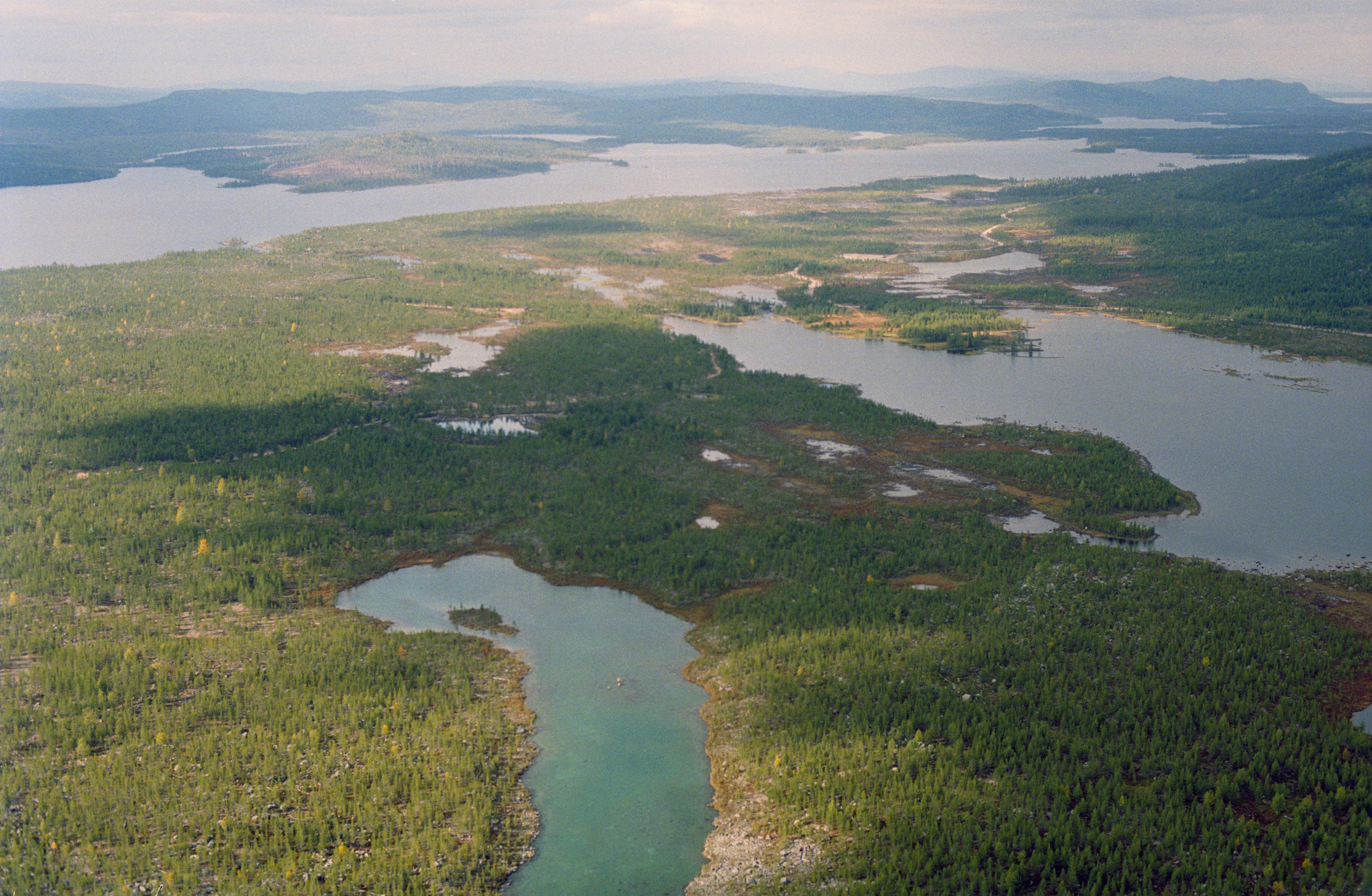 Beskrivning: Området Jilggismuotkke mellan sjöarna Gallajaure (Gállájávvre) till höger och i bildens övre del Stor-Mattaure (Stuor Máttávrre). Vid bildens mitt boplats RAÄnr Arjeplog 3766, 3768, härd Arjeplog 3780, m.m. Bilden är tagen mot (väderstreck): NO
