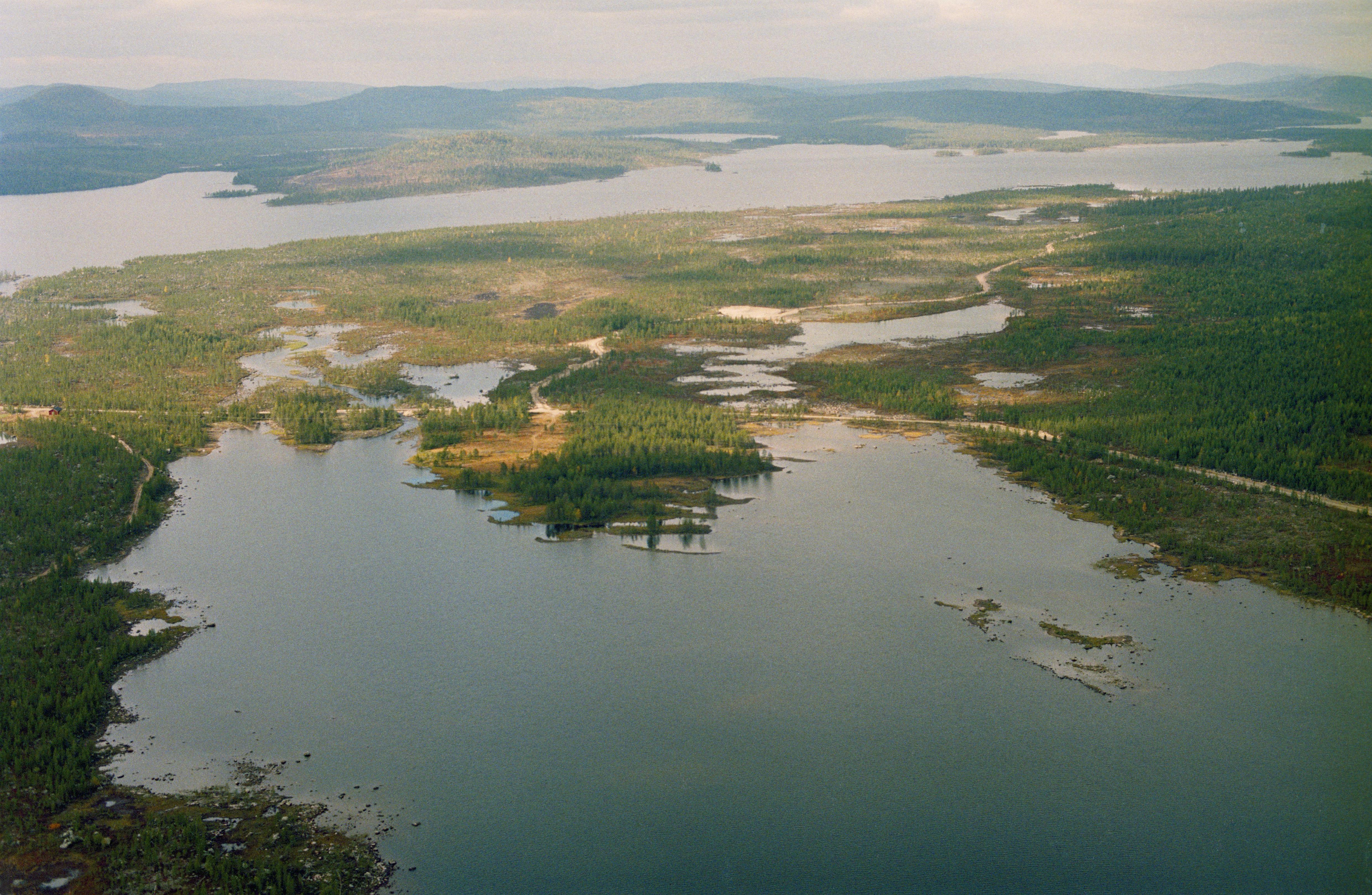 Beskrivning: Området Jilggismuotkke mellan sjöarna Gallajaure (Gállájávvre) och i bildens övre del Stor-Mattaure (Stuor Máttávrre). I viken till höger om bildens mitt kolningsanläggning RAÄnr Arjeplog 3782 m.fl. Över bildens mitt boplats RAÄnr Arjeplog 185:1 vid ett rengärde. Bilden är tagen mot (väderstreck): VNV