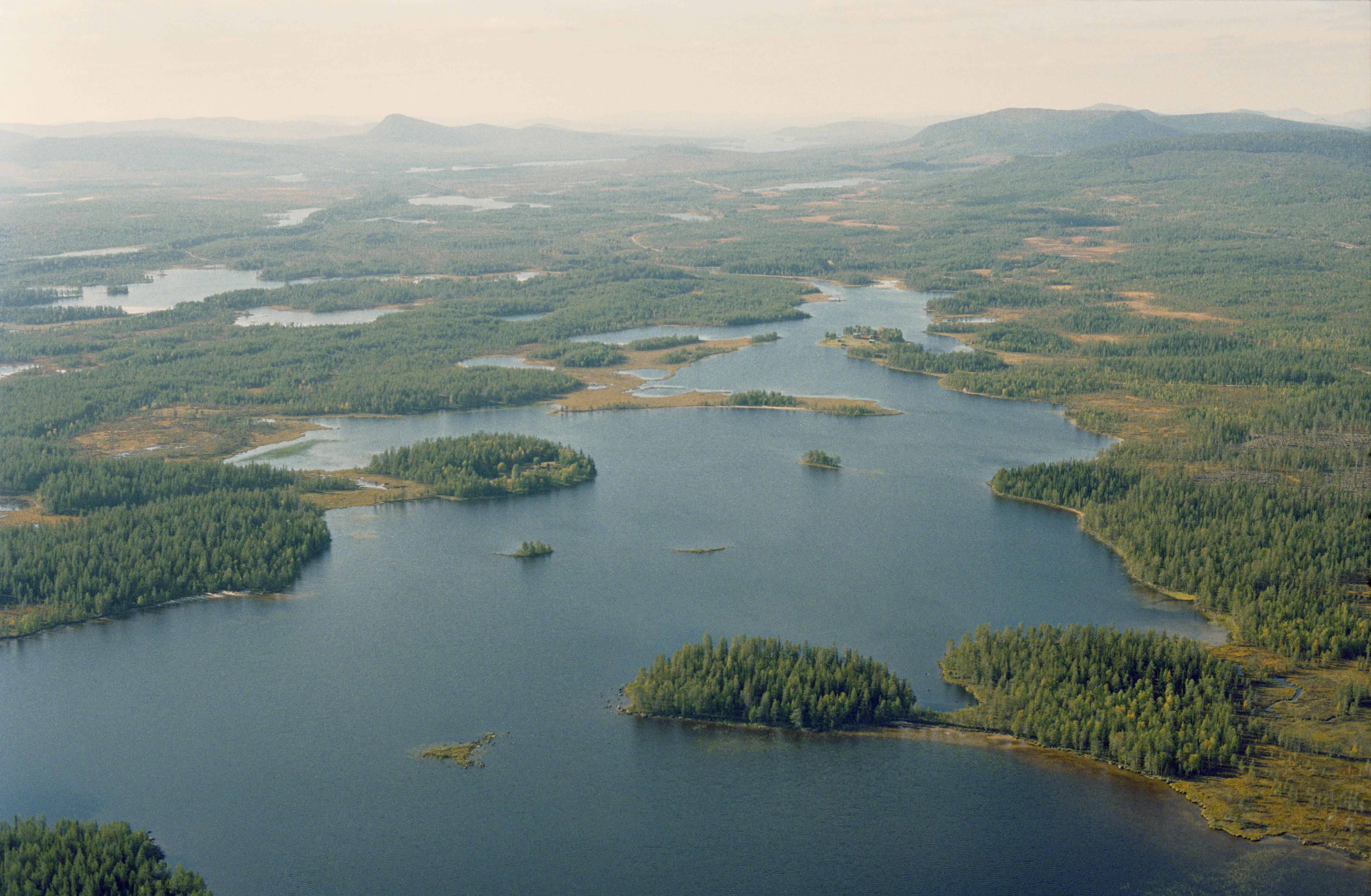 Beskrivning: Sjön Tallträsk. Över udden till vänster om bildens mitt boplats RAÄnr Arvidsjaur 199:1. Avaviken m.m. till höger i bildens övre kant. Bilden är tagen mot (väderstreck): VNV