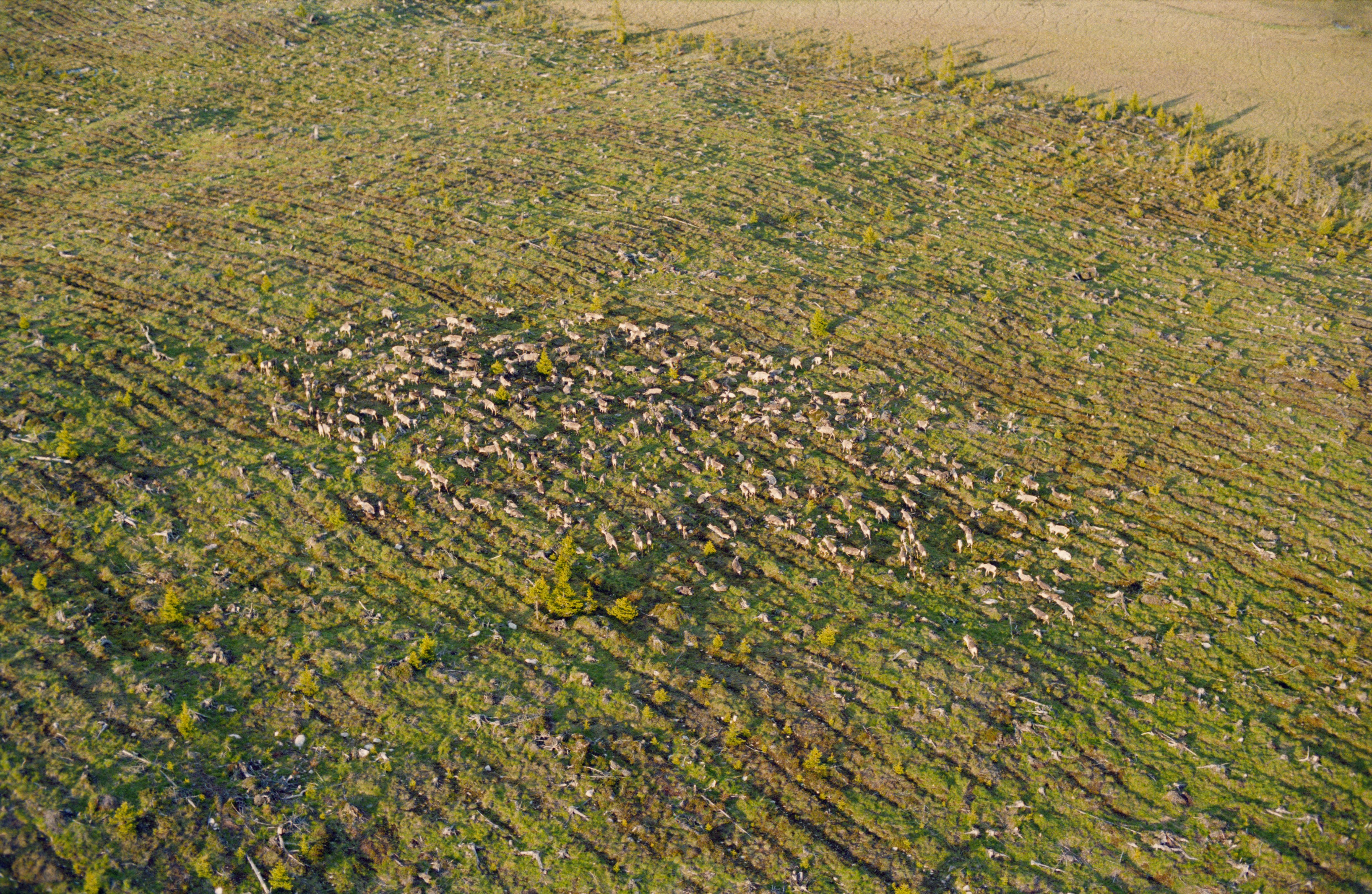 Beskrivning: Geijaurevallen, en renvall vid sjön Geijaure (Giejjure). Renhjord på Geijaurmyran. Bilden är tagen mot (väderstreck): SV