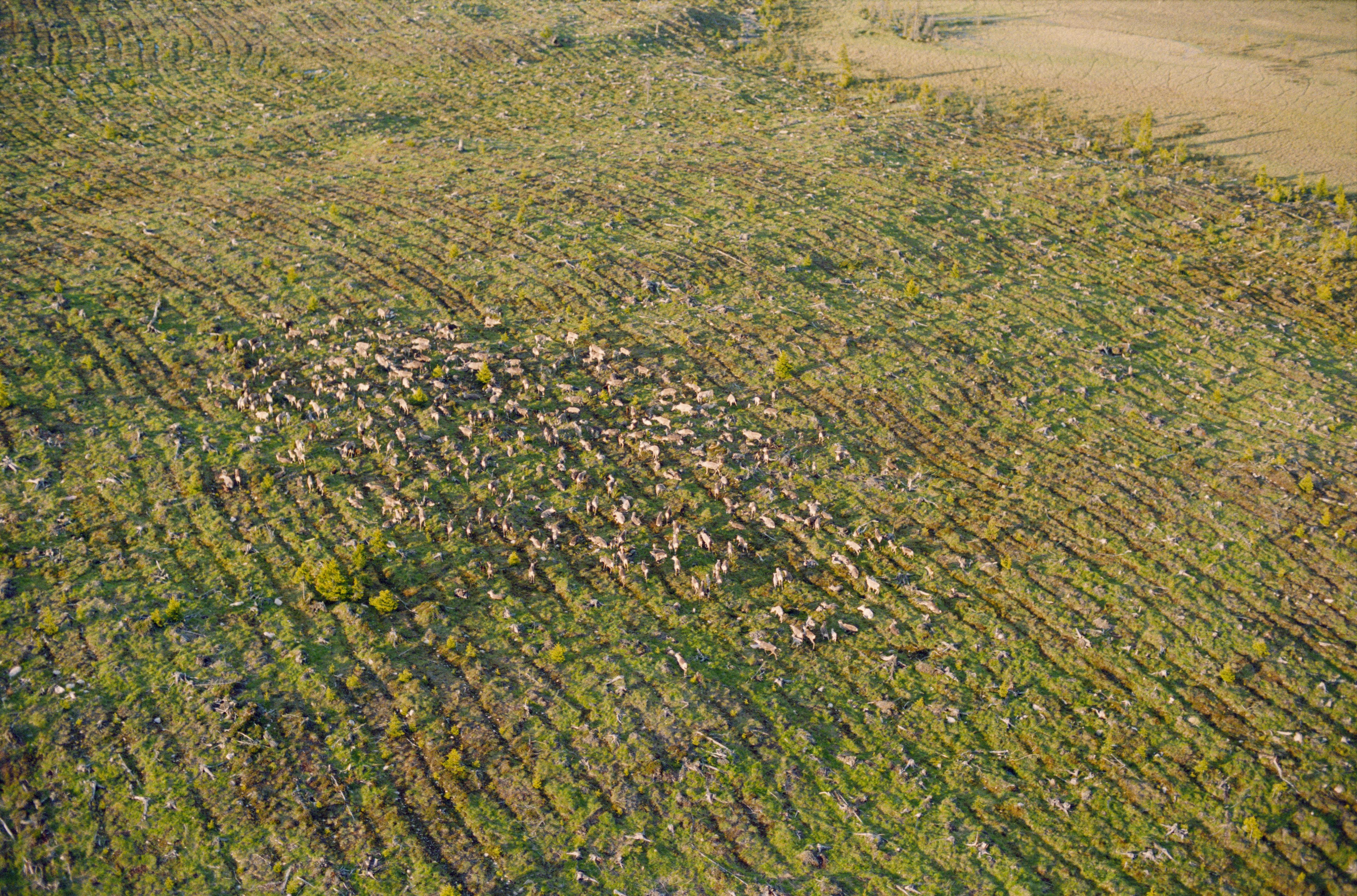 Beskrivning: Geijaurevallen, en renvall vid sjön Geijaure (Giejjure). Renhjord på Geijaurmyran. Bilden är tagen mot (väderstreck): S
