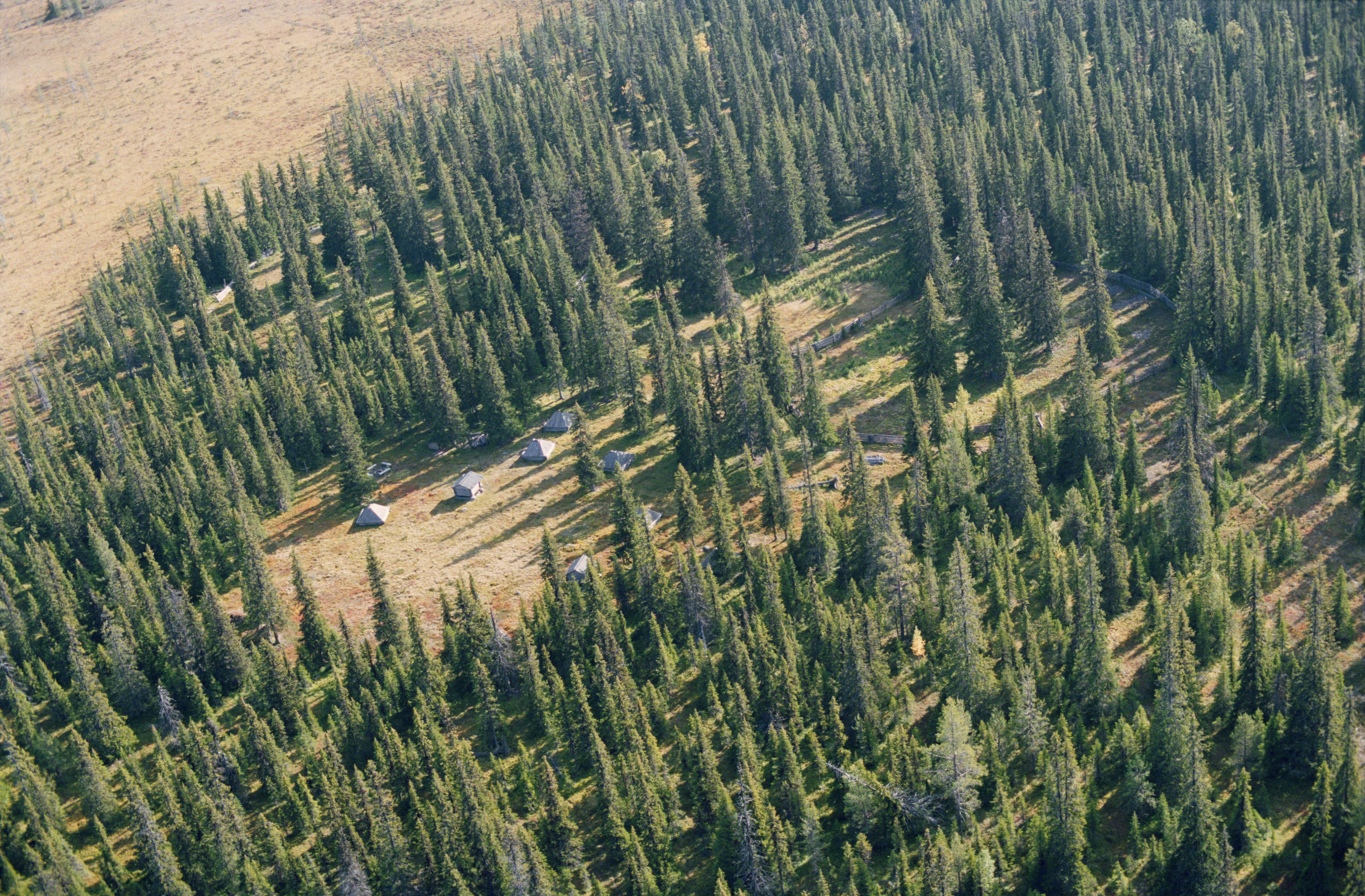 Beskrivning: Tjadnes (Tjadnas), ett skogssamiskt sommarviste. Vid vistet ett rengärde RAÄnr Arvidsjaur 2488:1. Området ingår i Tjadnesvare naturreservat. Bilden är tagen mot (väderstreck): SO