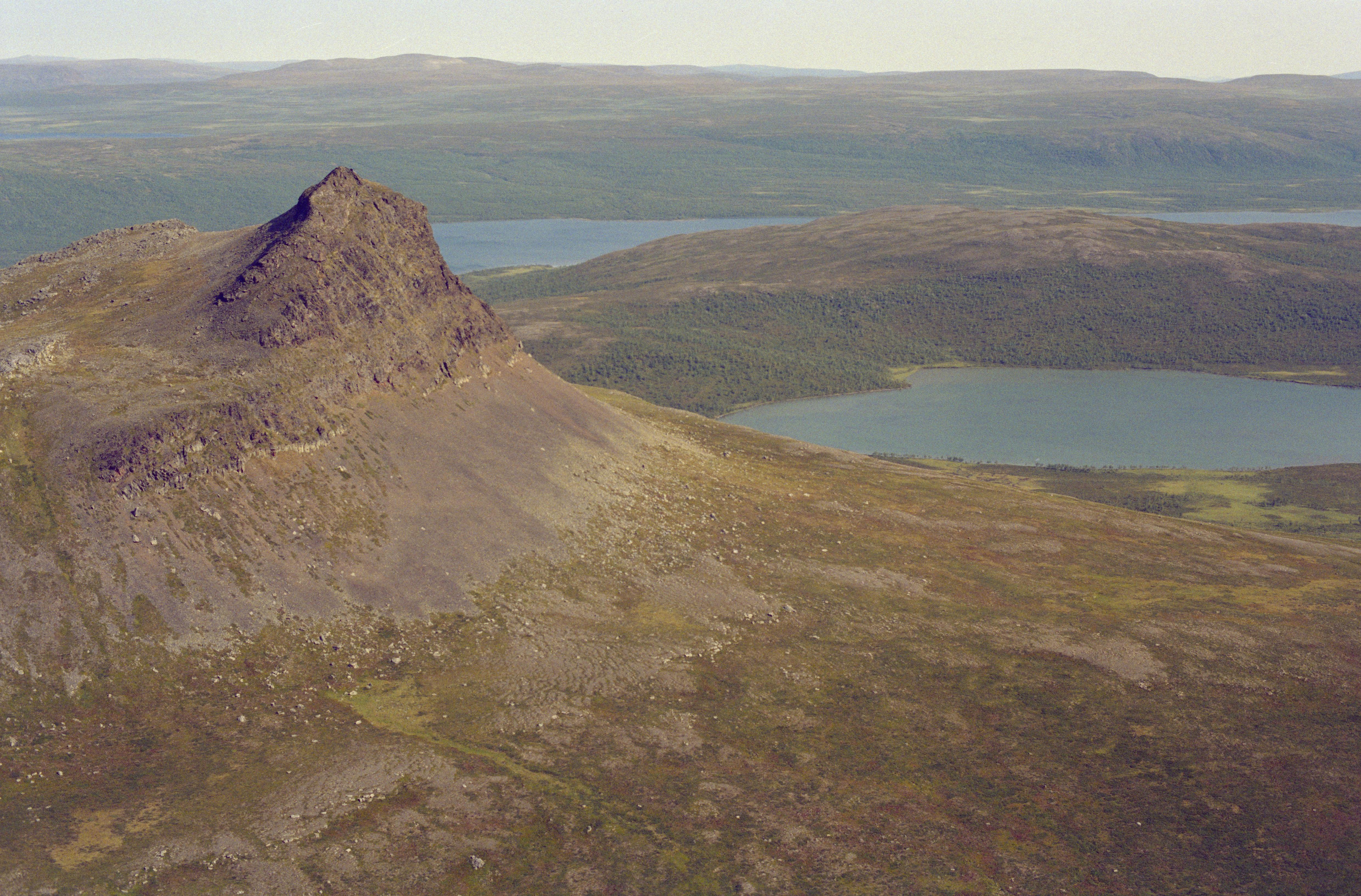 Beskrivning: Till vänster fjället Akkavare (Áhkávárri) med offerplats RAÄnr Gällivare 60:1. Till höger om bildens mitt sjön Läffasaiva (Laeffásáiva) med visten, fiskeseite och offerplats RAÄnr Gällivare 59:1 vid berget Muovlak. I bildens övre del sjön Vuoleo Kaitumjaure (Vuolip Gáidumjávri). Sjaunja naturreservat. Bilden är tagen mot (väderstreck): NO