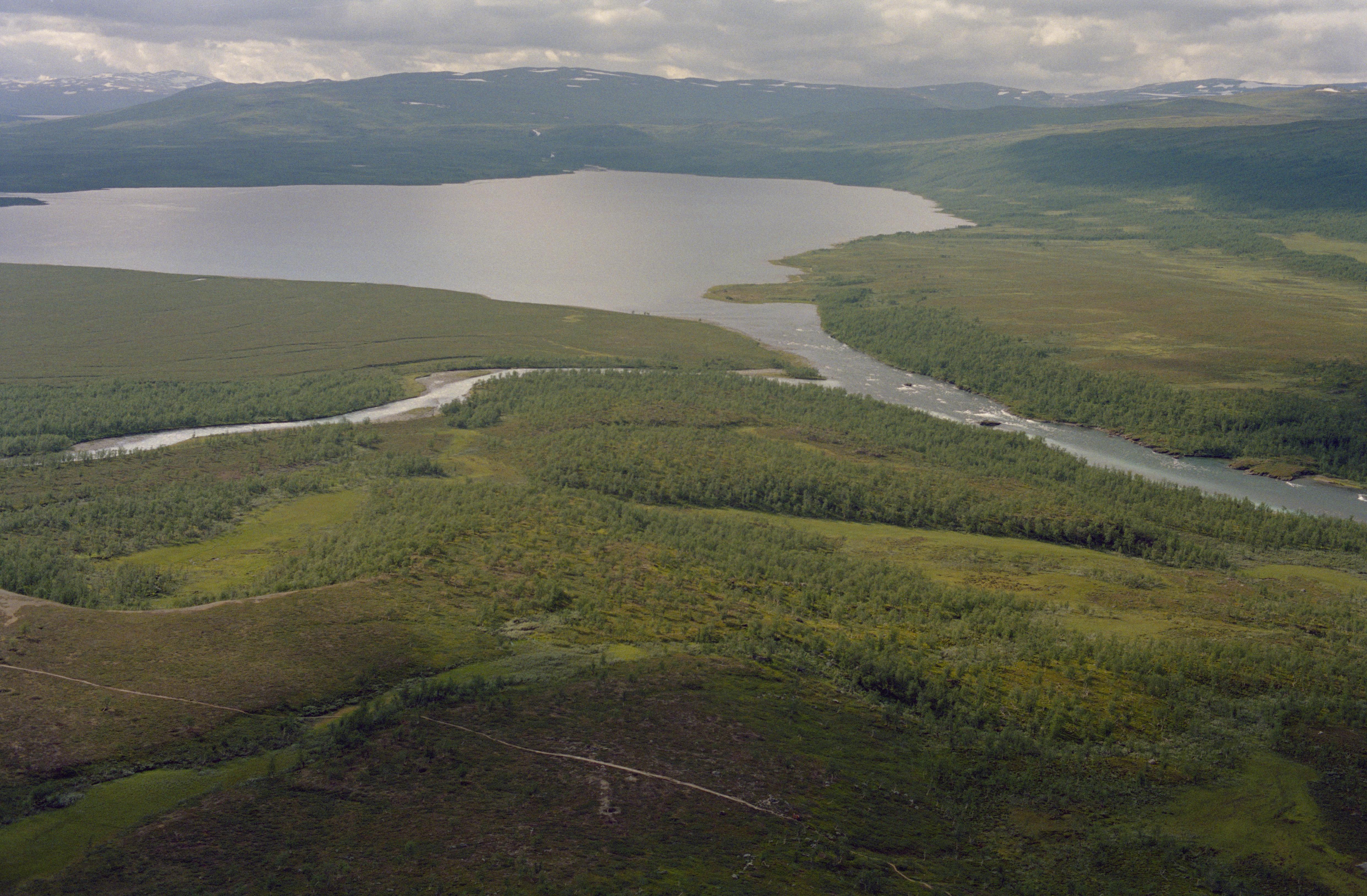 Beskrivning: Vandringsleden Padjantaleden vid sjön och samevistet Kutjaure (Guvtjávrre). I bildens mitt rinner ån Vuojatätno (Vuojatädno) inn i sjön vid Vujatstugan. Vid ån flera härdar RAÄnr Jokkmokk 991:1, 993:1, m.fl. Området ingår i Padjelanta (Badjelánnda) nationalpark och världsarvet Laponia. Bilden är tagen mot (väderstreck): VNV