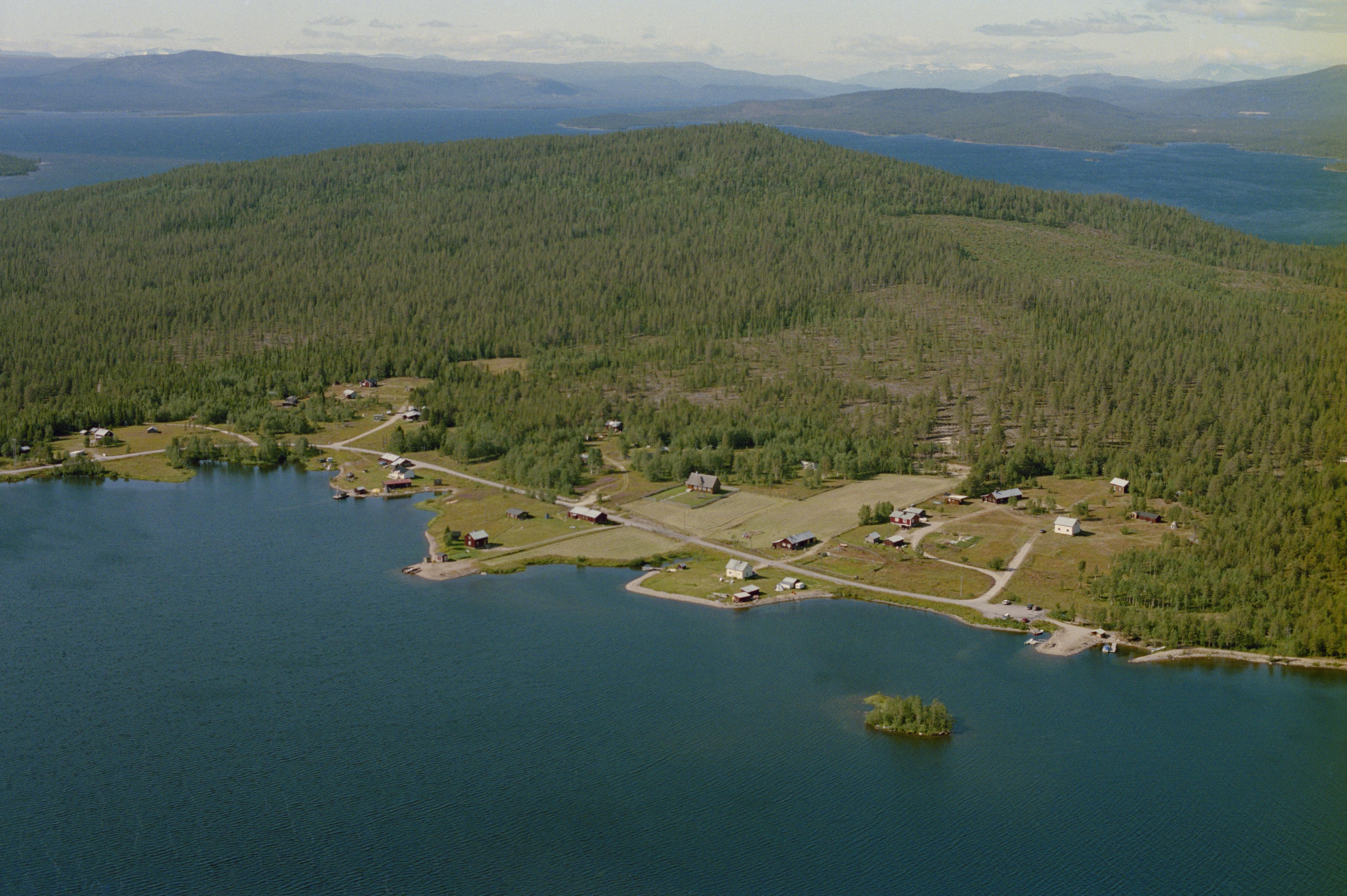 Beskrivning: Orten Ålloluokta (Oalloluokta) vid sjön Stora Lulevatten (Stuor Julevu) och Stora Luleälven (Stuor Julevädno). Ålloluokta kapell vid bildens mitt. Vid stranden till vänster en offerplats RAÄnr Jokkmokk 382:1, m.m. Bilden är tagen mot (väderstreck): VNV