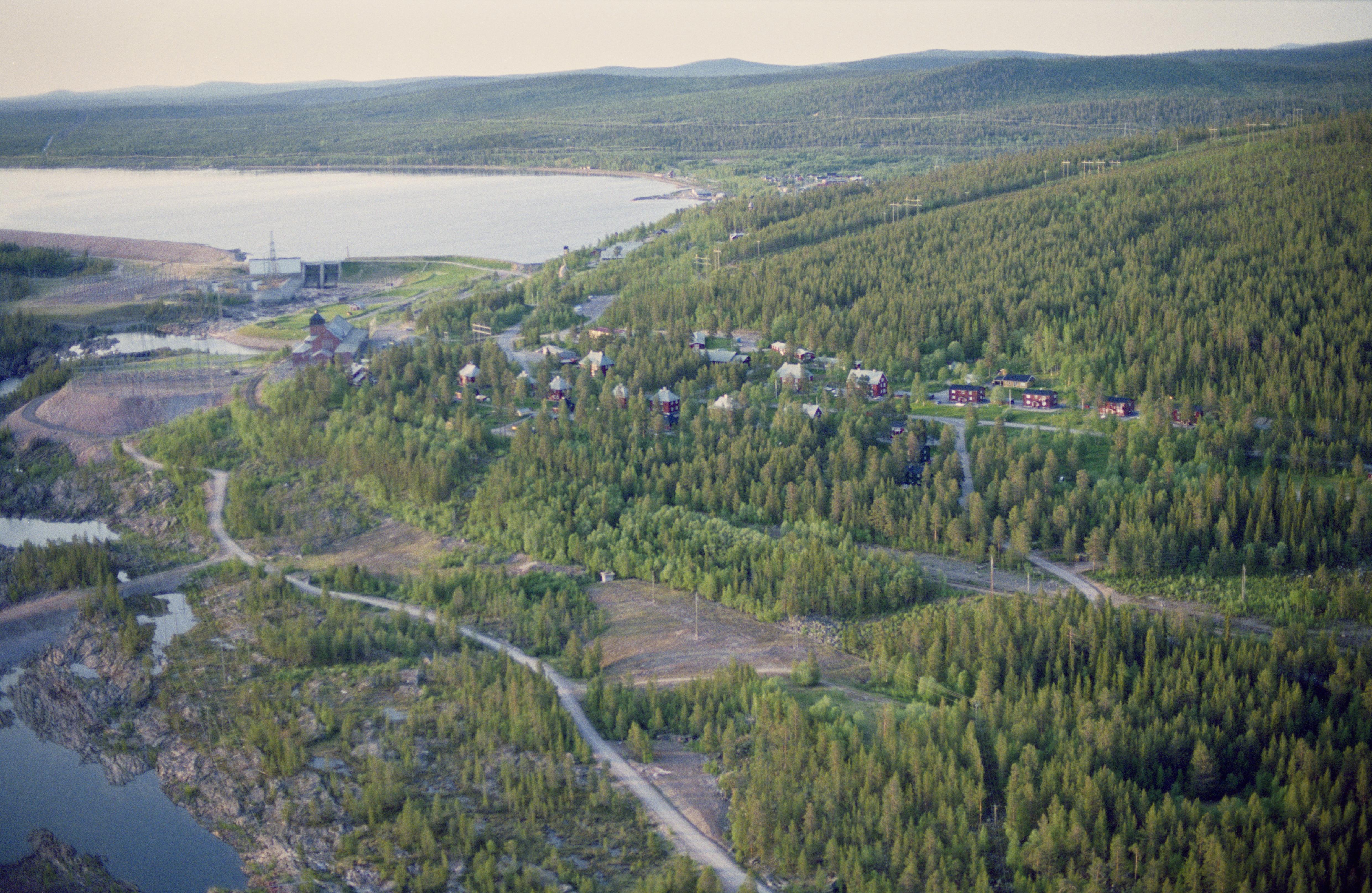 Beskrivning: Porjus (Bårjås) tätort och kraftverkssamhälle vid sjön Stora Lulevatten (Stuor Julevu) och Stora Luleälven (Stuor Julevädno). Uppe till vänster Porjus kraftverk (nya och gamla) och minnesmärke RAÄnr Jokkmokk 1750:1. Porjus gamla kraftverk är byggnadsminne och industriminne. Bilden är tagen mot (väderstreck): NNO
