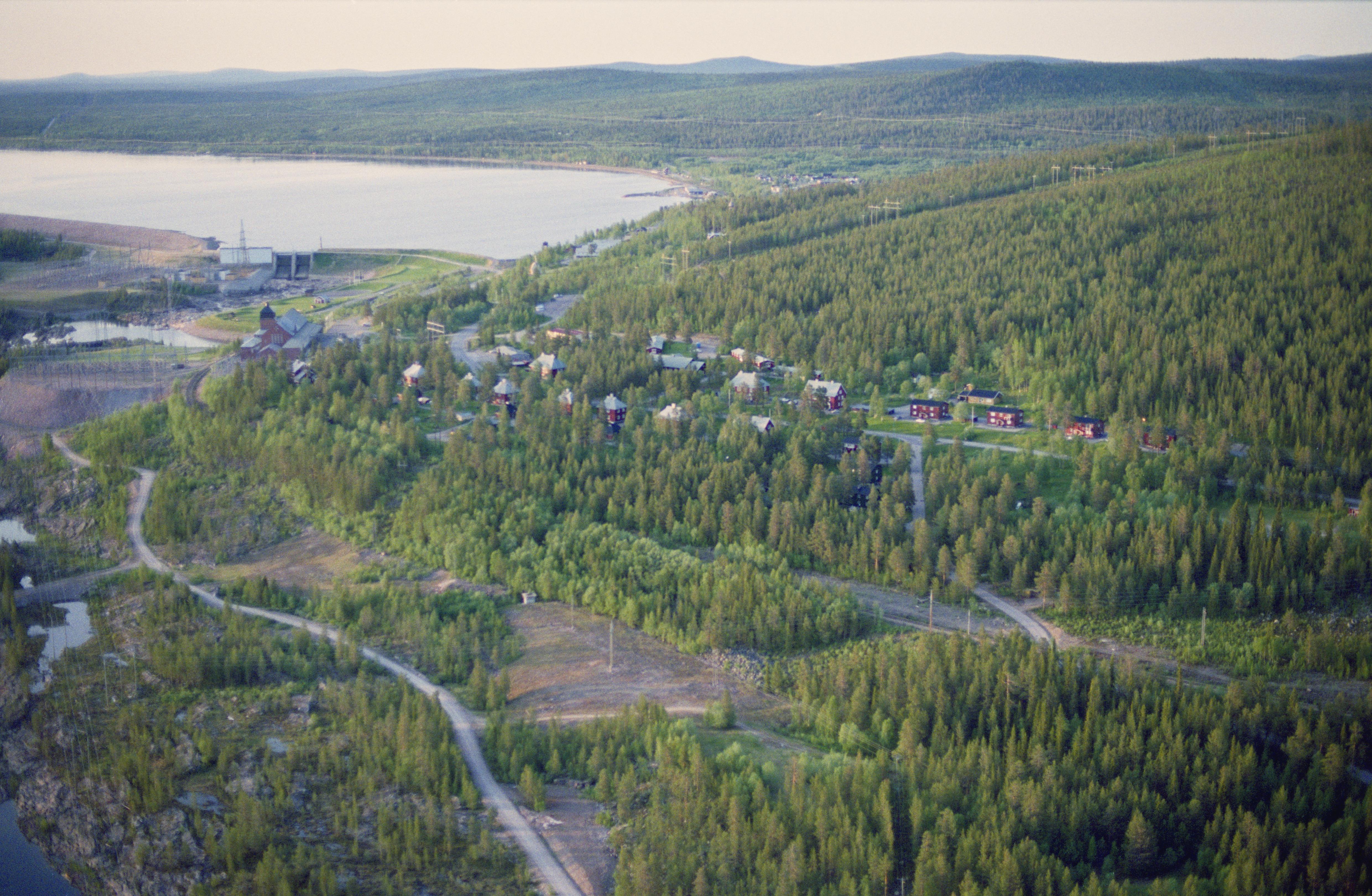 Beskrivning: Porjus (Bårjås) tätort och kraftverkssamhälle vid sjön Stora Lulevatten (Stuor Julevu) och Stora Luleälven (Stuor Julevädno). Uppe till vänster Porjus kraftverk (nya och gamla) och minnesmärke RAÄnr Jokkmokk 1750:1. Porjus gamla kraftverk är byggnadsminne och industriminne. Bilden är tagen mot (väderstreck): NNO