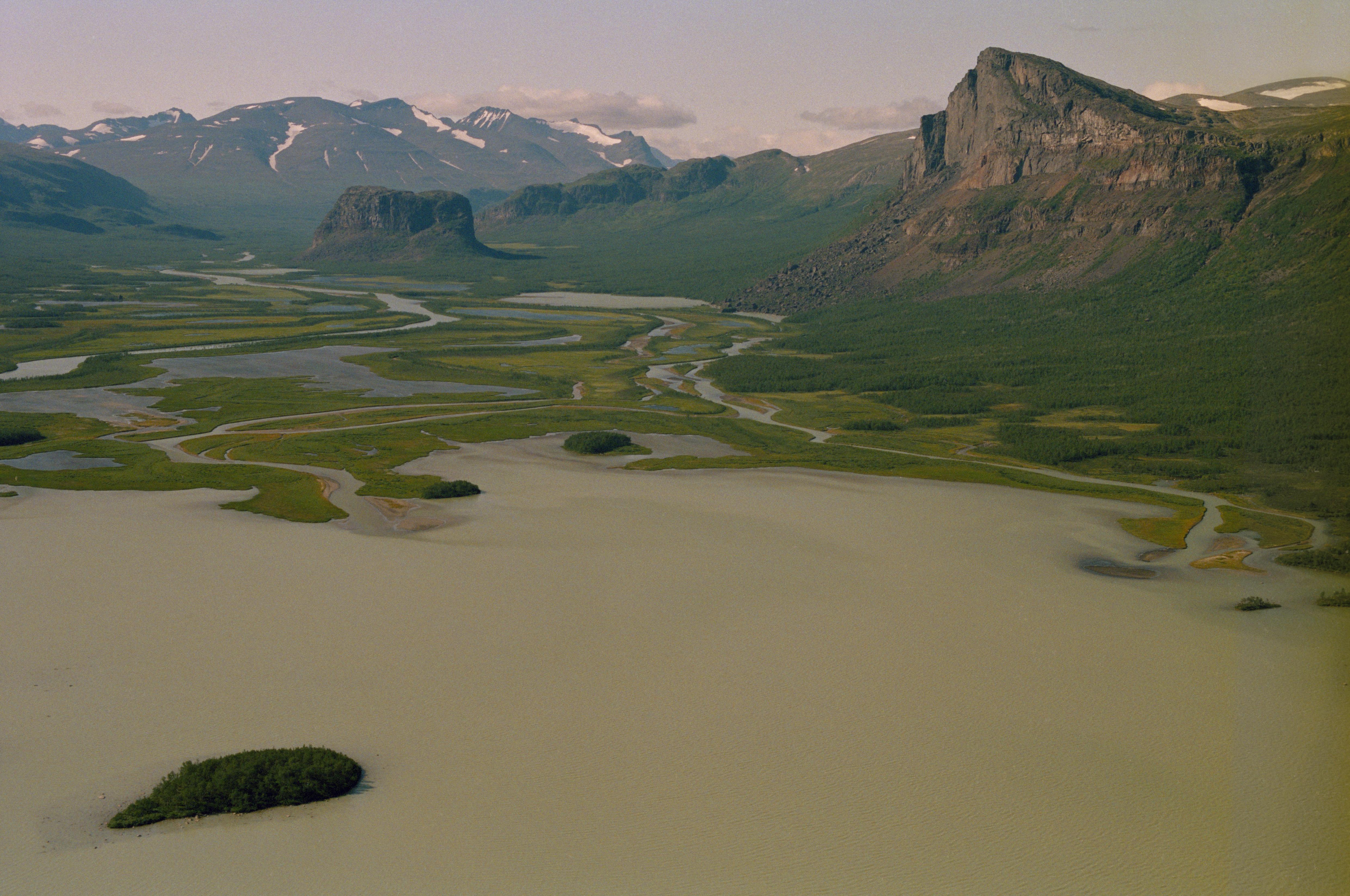 Beskrivning: Sjön Laitaure (Lájtávrre / Lajtjaure), västra delen. Över bildens mitt Rapadeltat vid Rapadalen (Ráhpavuobme). I deltat offerplats RAÄnr Jokkmokk 52:1. Ultevis fjällurskogs naturreservat. Bilden är tagen mot (väderstreck): NV