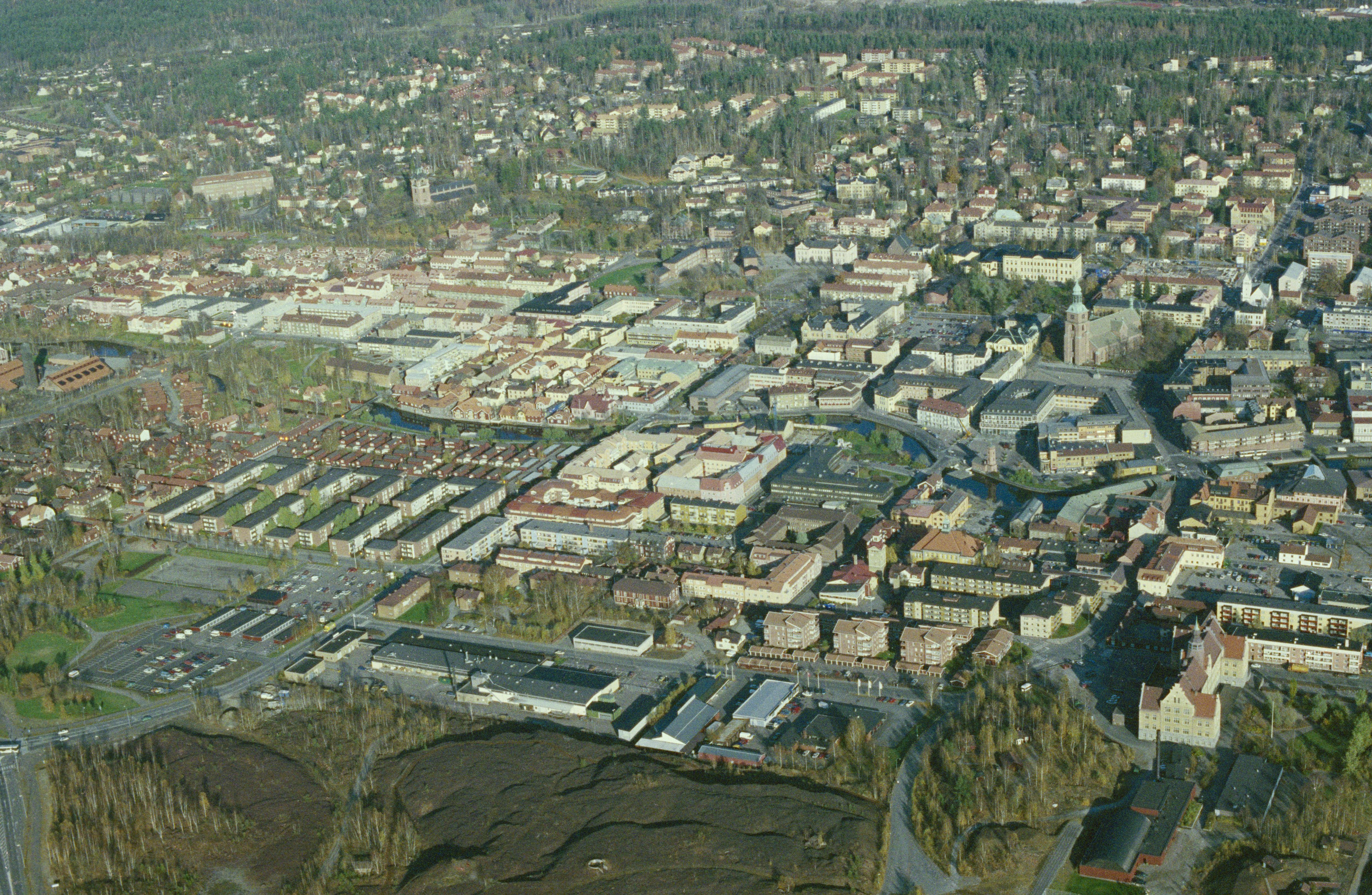 Beskrivning: Falu stad vid Faluån. Stora Kopparbergs kyrka till vänster om bildens mitt, Falu Kristine kyrka till höger under bildens mitt. Bilden är tagen mot (väderstreck): NO