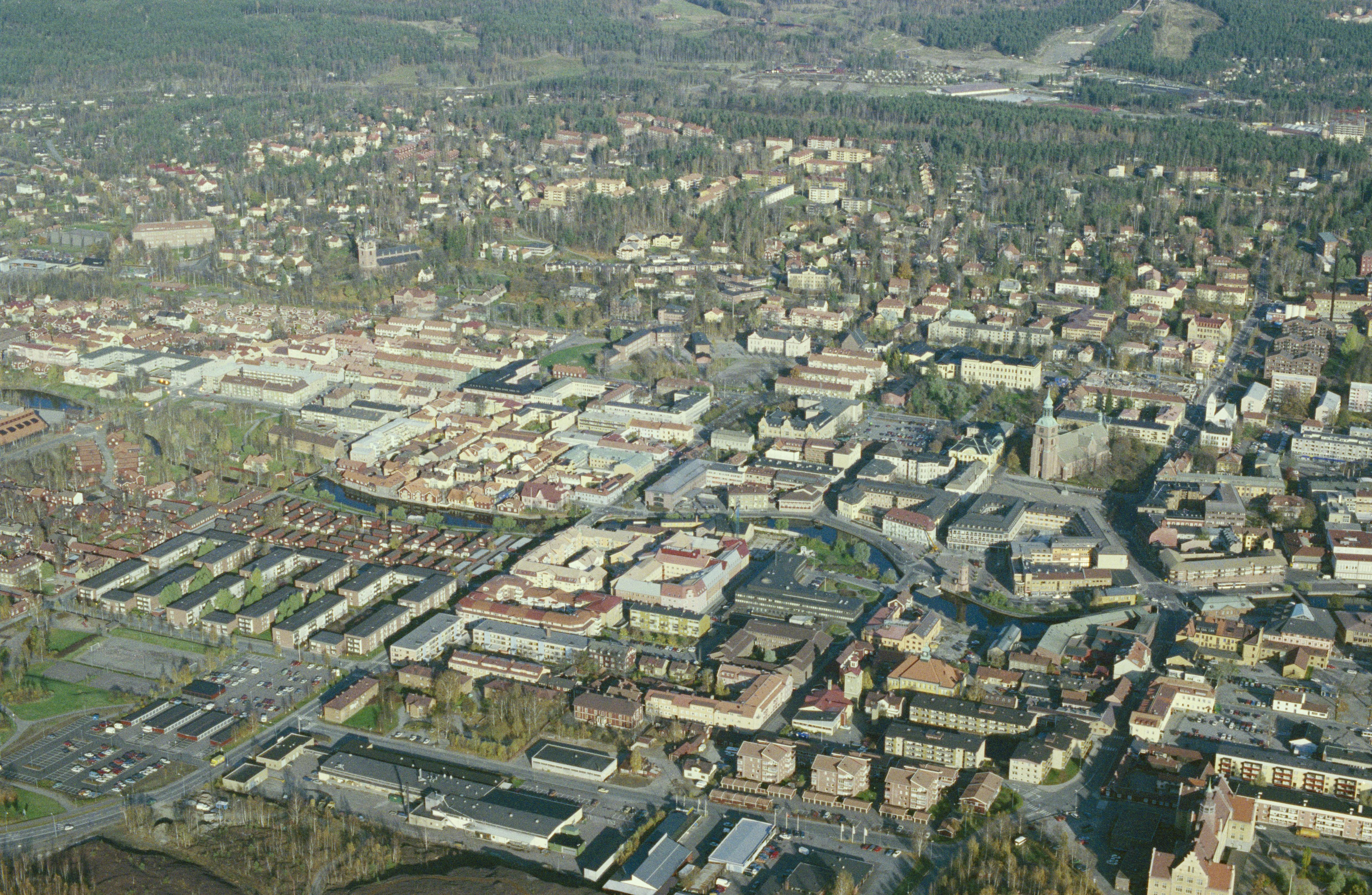 Beskrivning: Falu stad vid Faluån. Stora Kopparbergs kyrka till vänster om bildens mitt, Falu Kristine kyrka till höger under bildens mitt. Bilden är tagen mot (väderstreck): NO