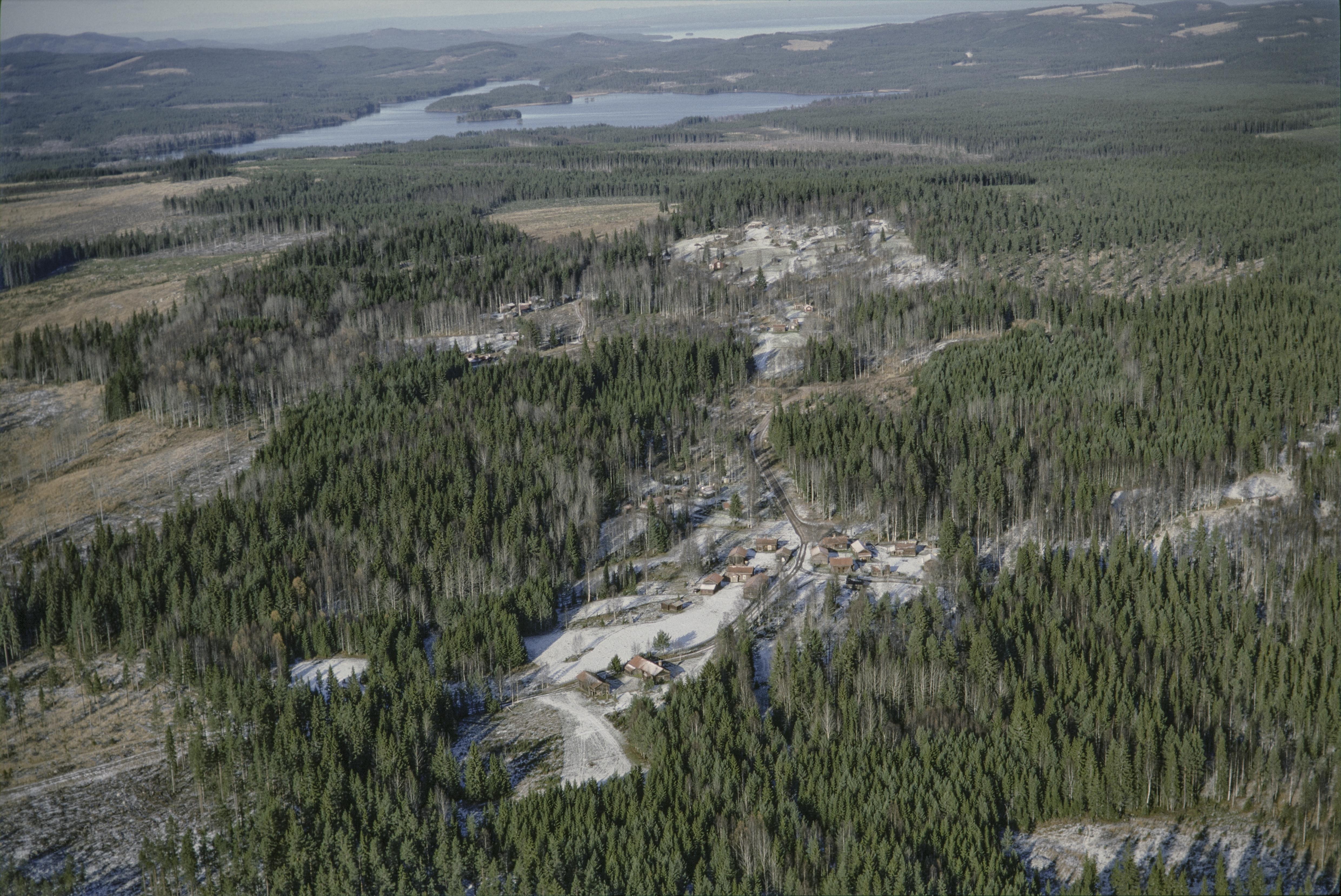Beskrivning: Fäbodsbyn Ljusbodarna med fäbodarna RAÄnr Leksand 513:1-8. Fäbod RAÄnr Leksand 513:8 till vänster under bildens mitt. Vandringsvägen Romboleden mot Skinnaråsen till höger i bildens nedre del. Sjön Ejen i bildens övre del. Bilden är tagen mot (väderstreck): N