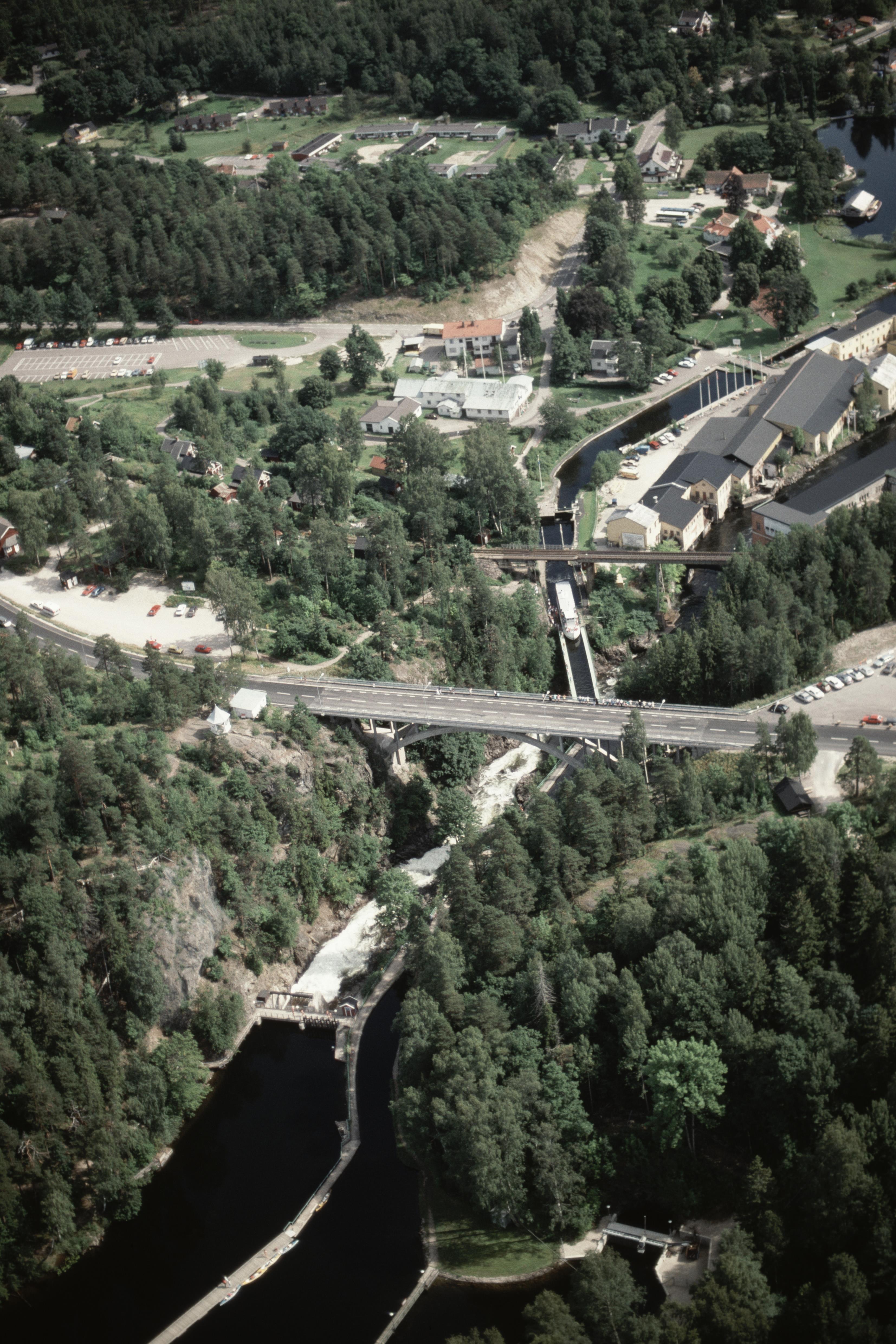 Beskrivning: Dalslands kanal vid byn Håverud, mellan sjöarna Åklång i väst och Övre Upperudshöljen i öst. Bro, järnvägsbro, akvedukt och sluss. Minnesmärke RAÄnr Skållerud 33:1-2. Bilden är tagen mot (väderstreck): Ö