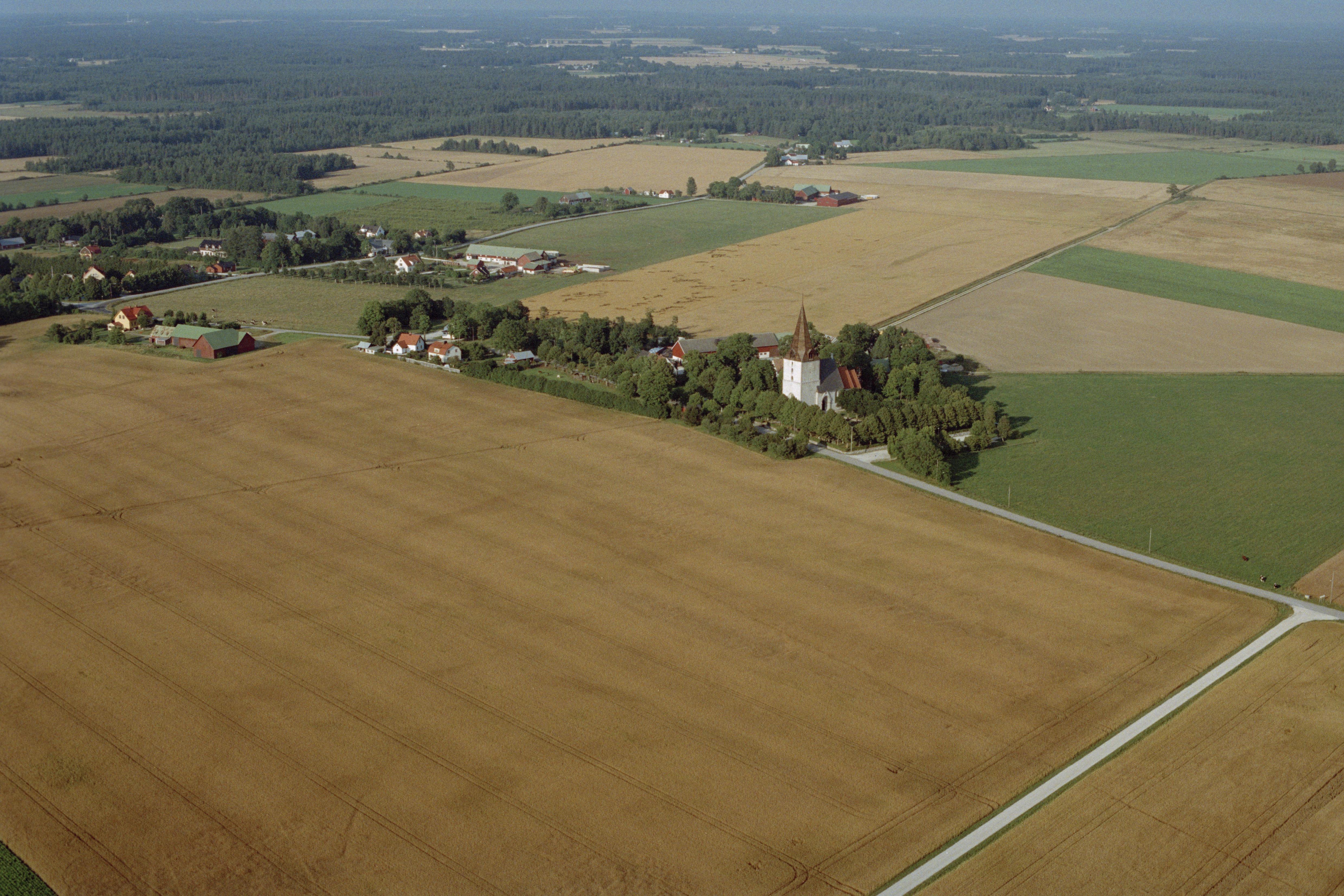 Beskrivning: Barlingbo kyrkby. Till höger om bildens mitt Barlingbo kyrka. I kyrkan gravvård RAÄnr Barlingbo 15:2. Bilden är tagen mot (väderstreck): NO