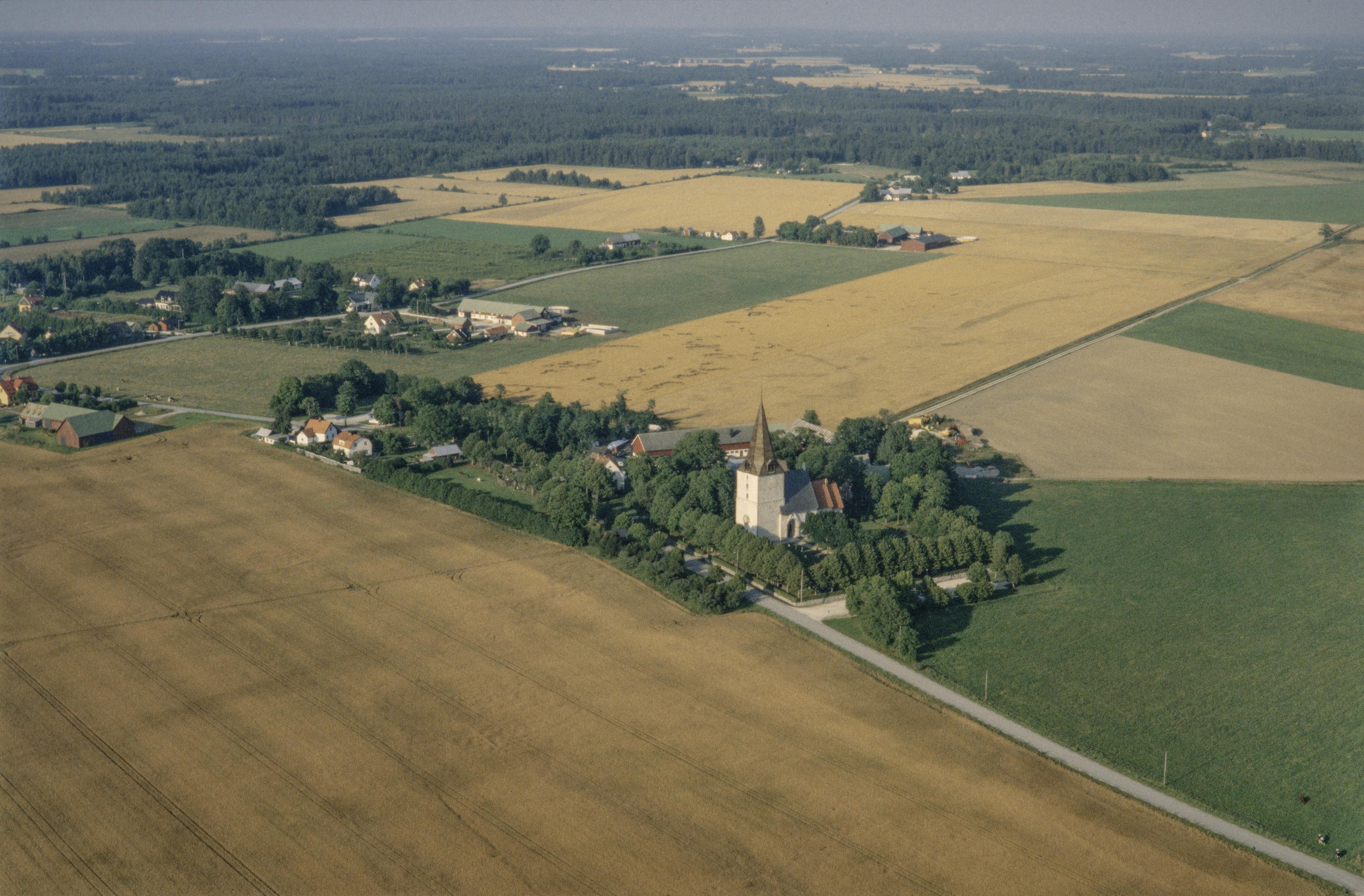 Beskrivning: Barlingbo kyrkby. Till höger om bildens mitt Barlingbo kyrka. I kyrkan gravvård RAÄnr Barlingbo 15:2. Bilden är tagen mot (väderstreck): NO