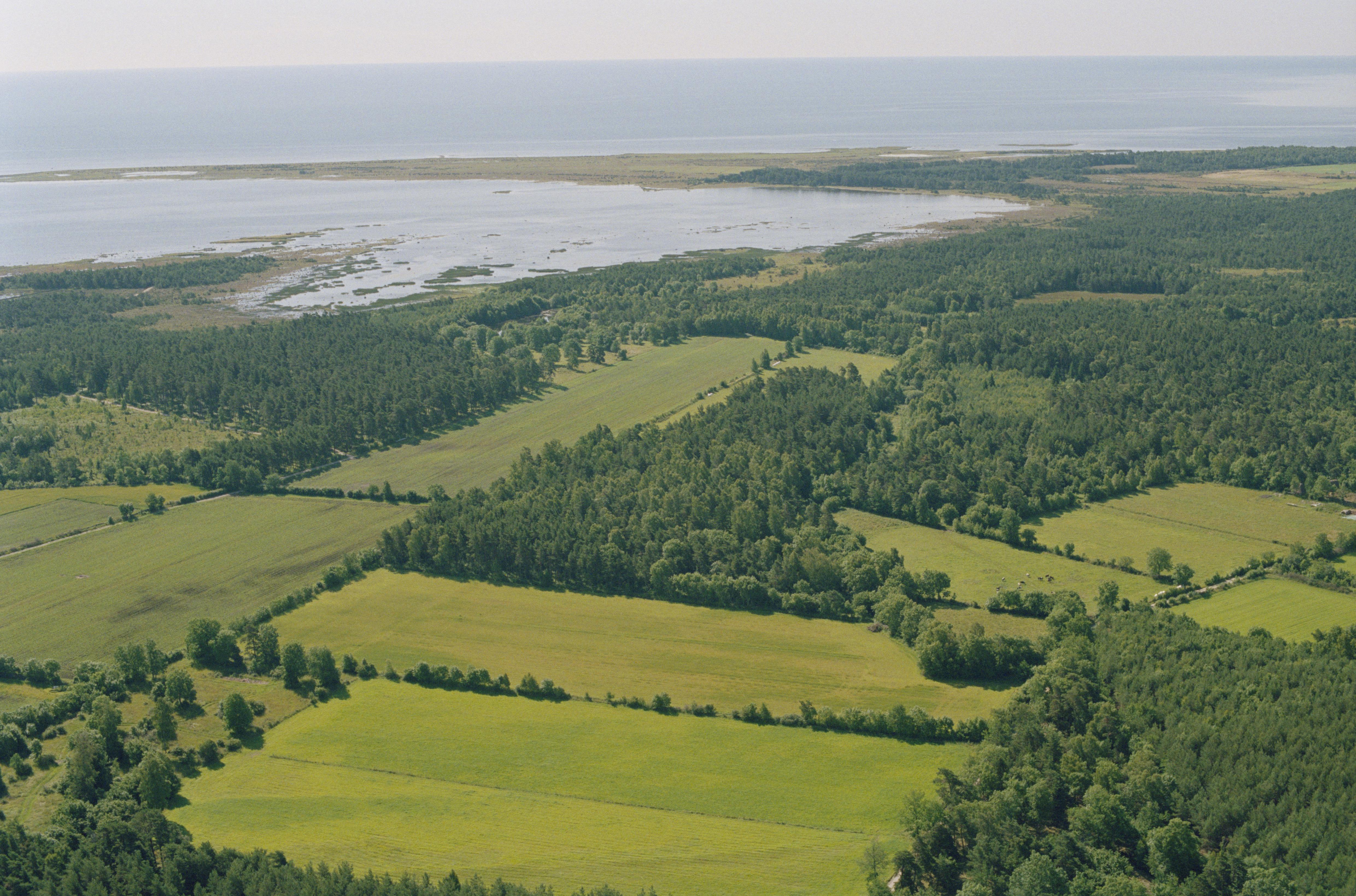 Beskrivning: Fornlämningsområdet Bandlundeviken. I bildens nedre del området söder om Häffinds gård. Vid bildens mitt området Strandhagen med hägnad RAÄnr Burs 30:1, stensättningar Burs 182:1-2 och stenar med slipyta Burs 180:1 m.fl. Näset Hummelbosholm i bildens övre del. Bilden är tagen mot (väderstreck): SO