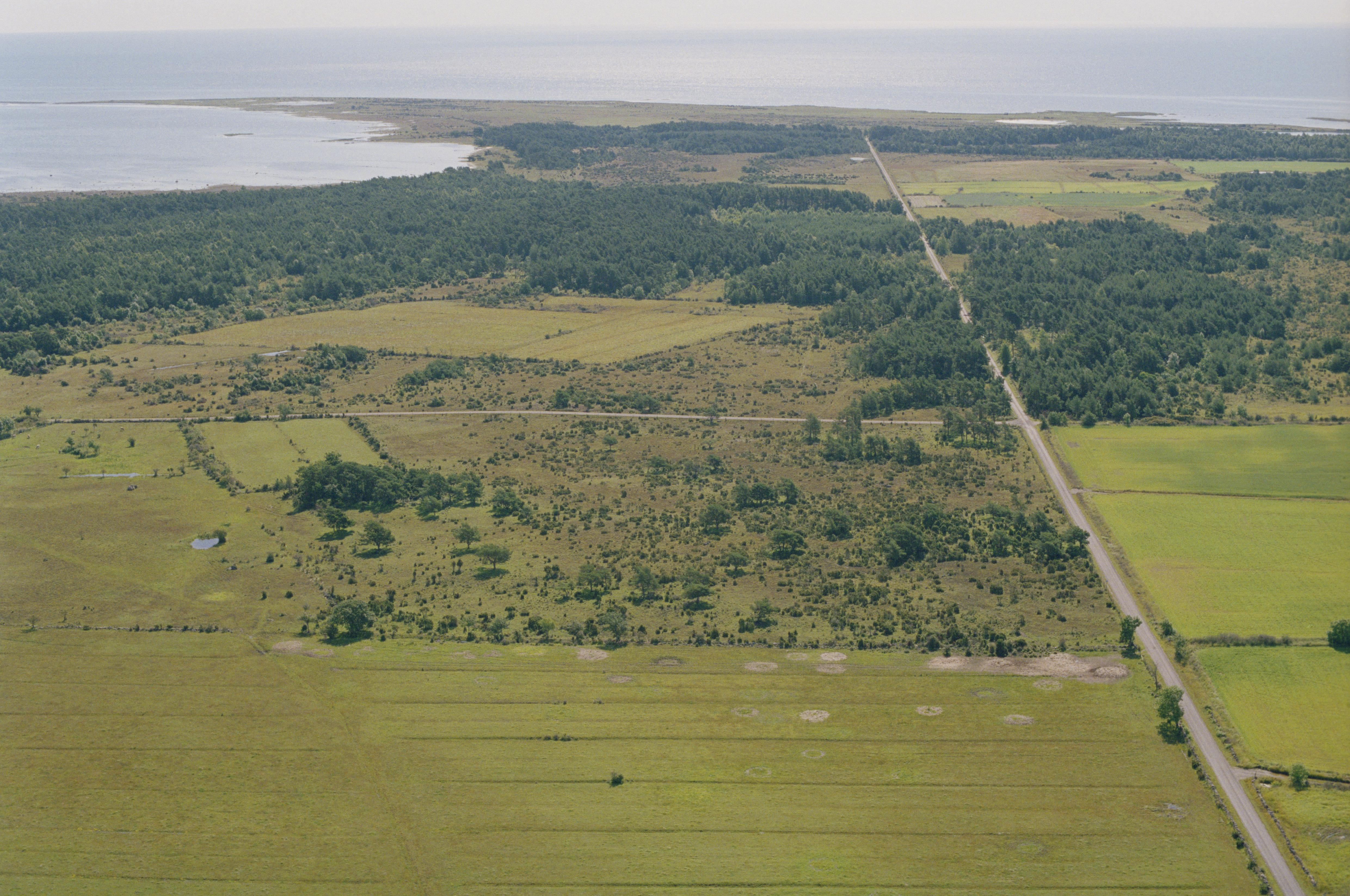 Beskrivning: Fornlämningsområdet Bandlundeviken. Vid bildens mitt området Nyhagen med cropmarks vid stensättning RAÄnr Burs 43:1 och 52:1 m.fl. Näset Hummelbosholm i bildens övre del. Bilden är tagen mot (väderstreck): SSO