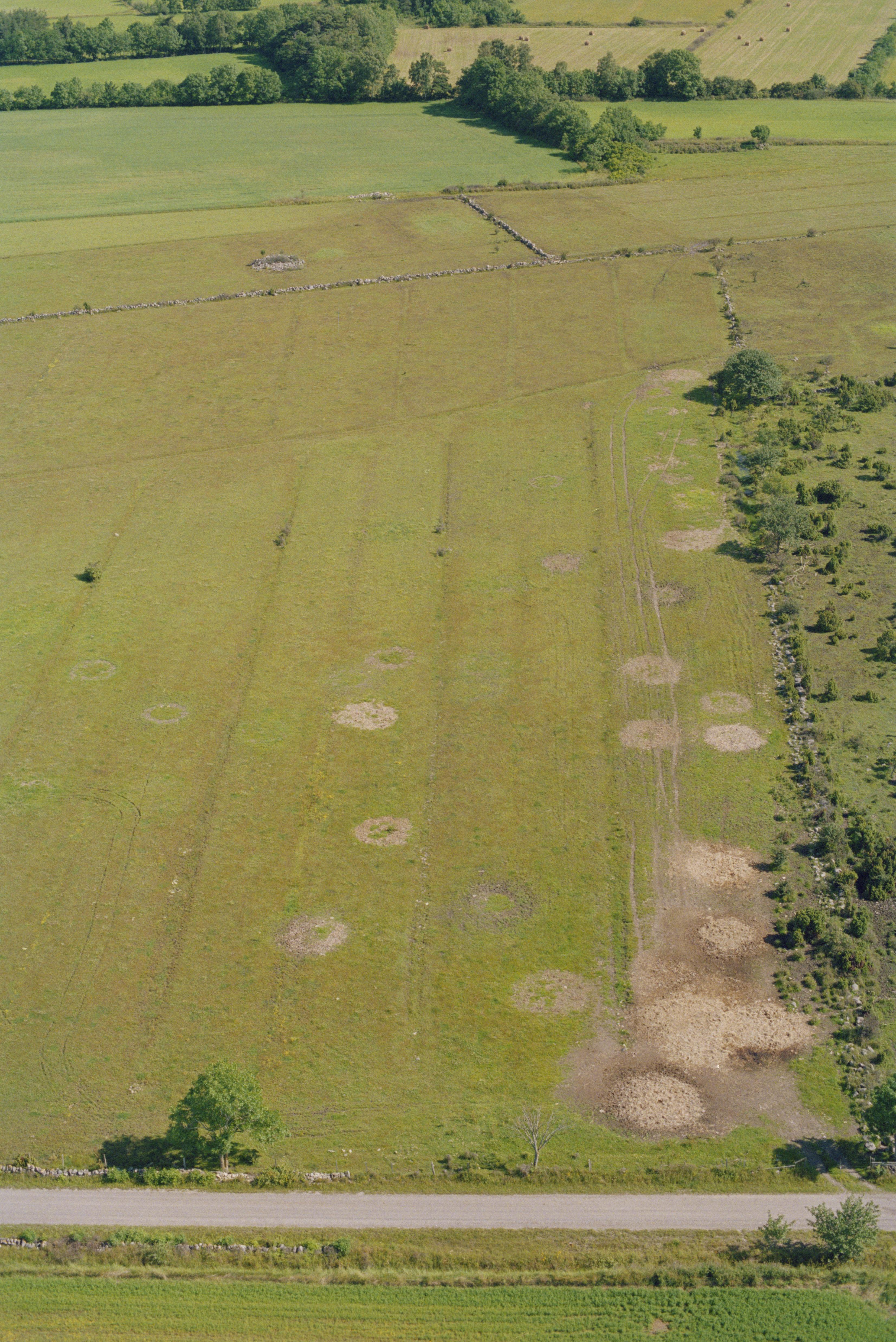 Beskrivning: Fornlämningsområdet Bandlundeviken. Vid bildens mitt området Nyhagen i området vid näset Hummelbosholm. Cropmarks i åker vid stensättning RAÄnr Burs 43:1. Bilden är tagen mot (väderstreck): SV
