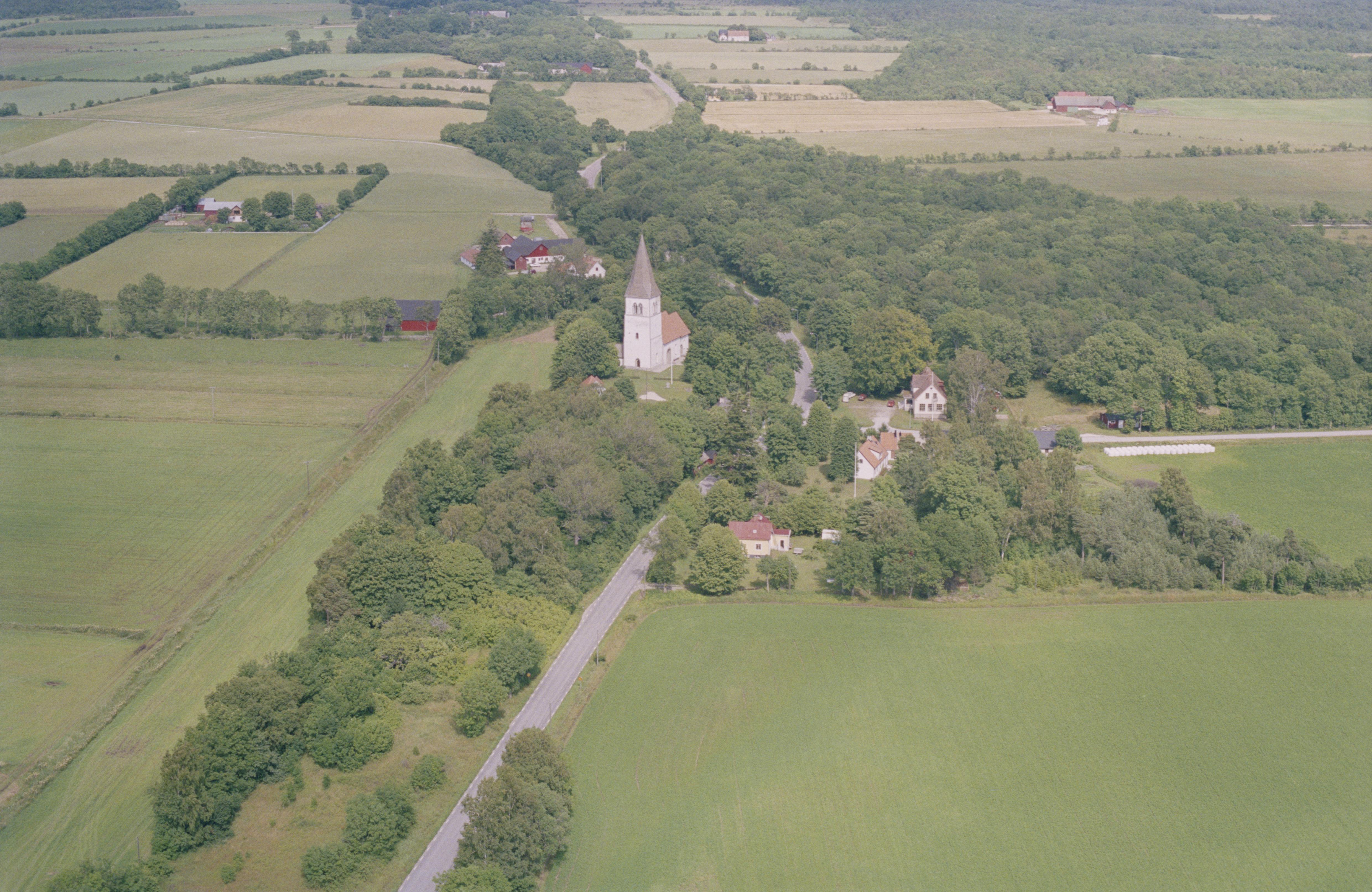 Beskrivning: Eke kyrka och kyrkby. Vid kyrkan vägmärke RAÄnr Eke 43:2. Bilden är tagen mot (väderstreck): ONO