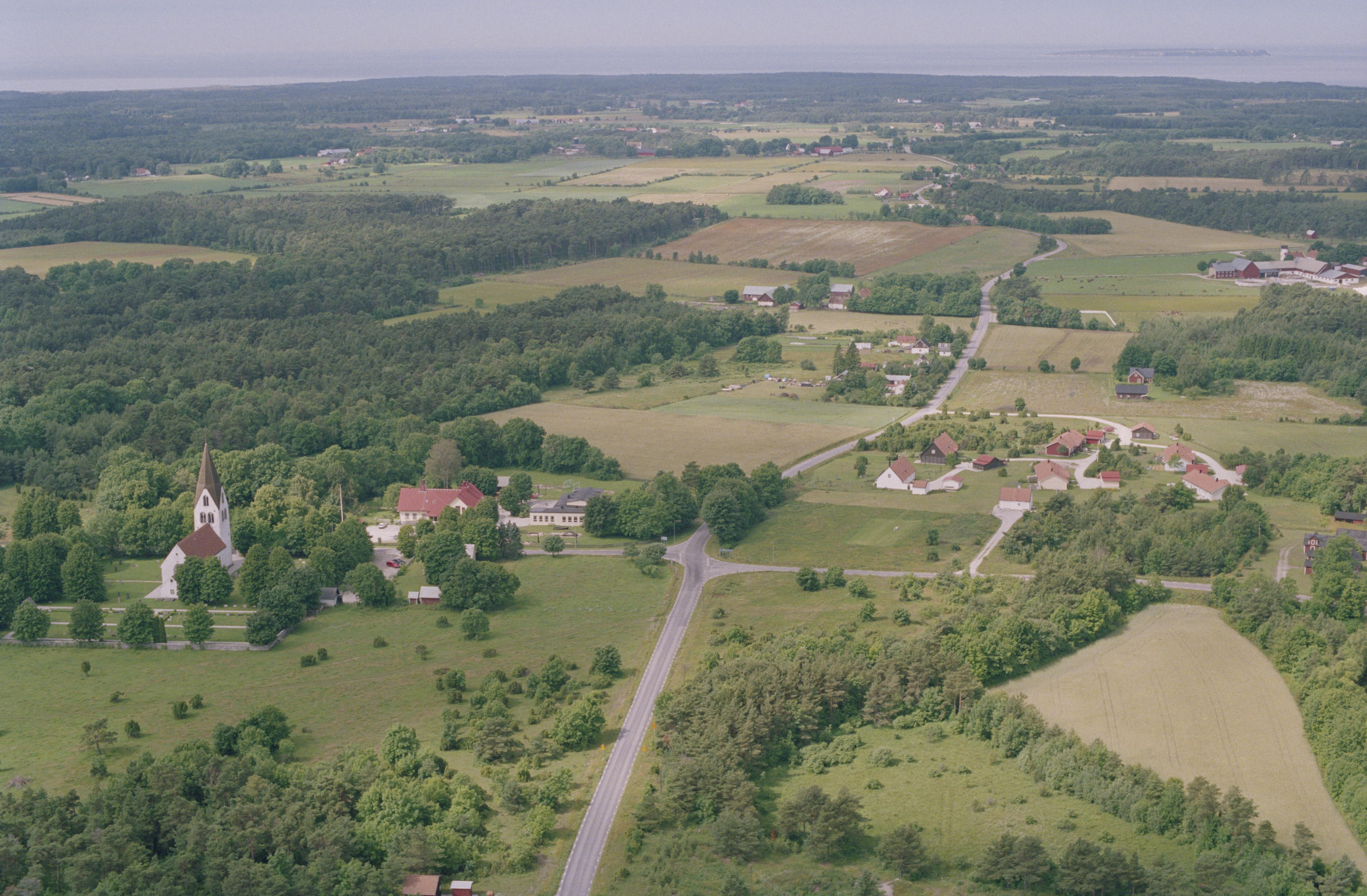 Beskrivning: Eksta kyrka och kyrkby. Vid kyrkan fyndplats (bronsfat, ringsölja av brons m.m.) RAÄnr Eksta 231:1. Stora Karlsö till höger i bildens övre kant. Bilden är tagen mot (väderstreck): VSV