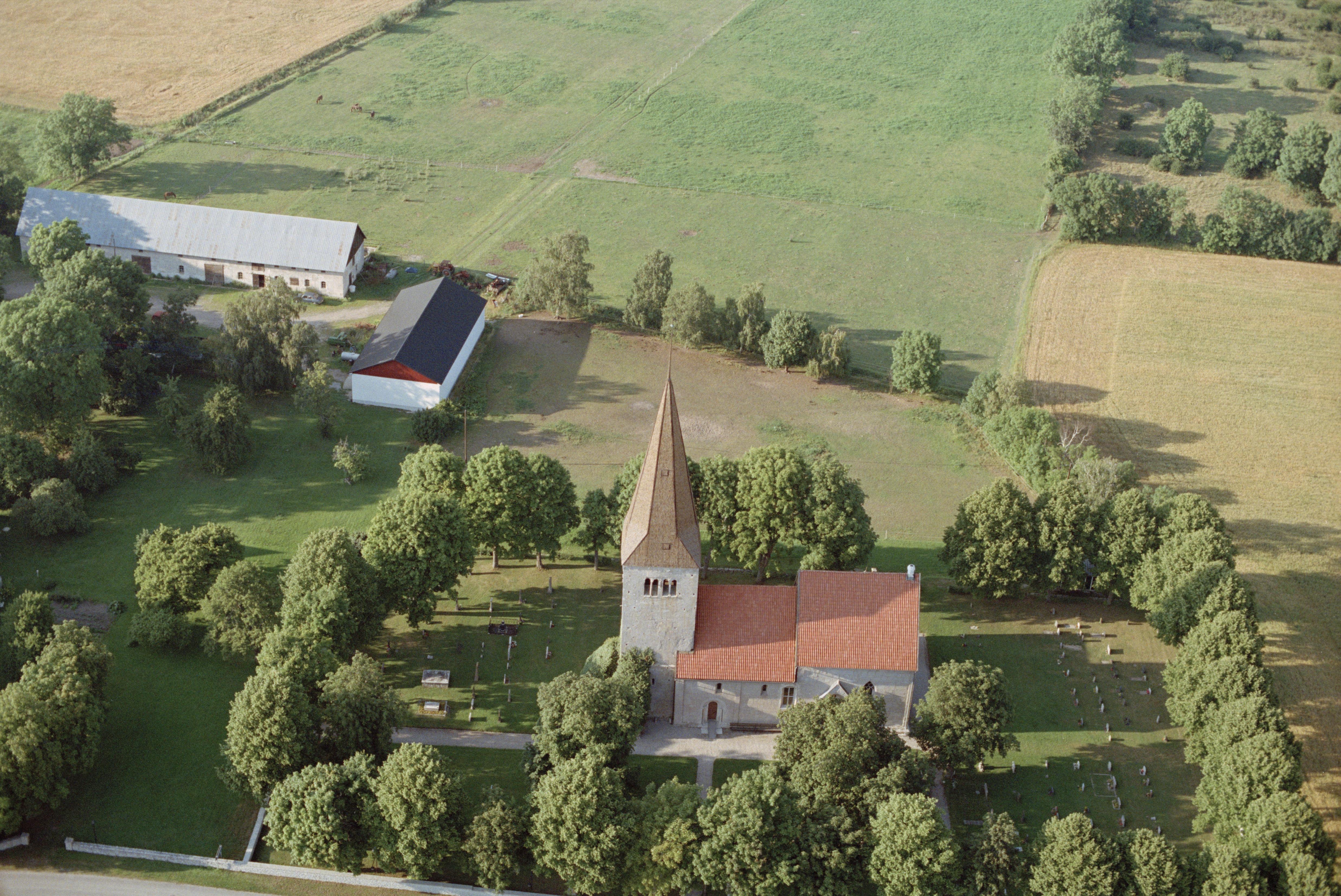 Beskrivning: Follingbo kyrka och kyrkby. I kyrkan runstensfragment RAÄnr Follingbo 84:1. Bilden är tagen mot (väderstreck): N