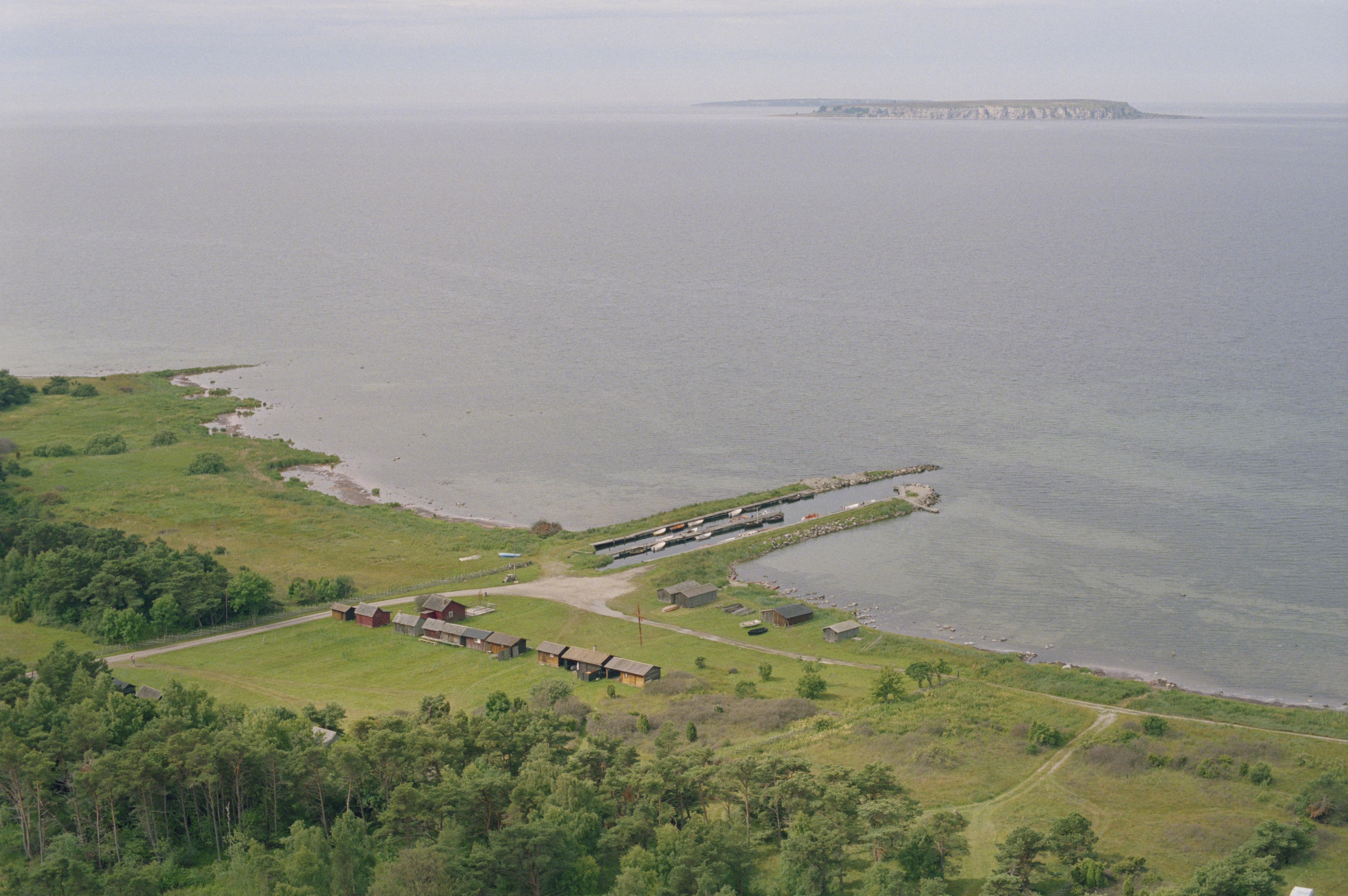 Beskrivning: Valbybodar fiskeläge. Vid piren under bildens mitt skeppslämning RAÄnr Fröjel 377. Karlsöarna i bildens övre del (Stora Karlsö skymtas bakom Lilla Karlsö). Bilden är tagen mot (väderstreck): SV
