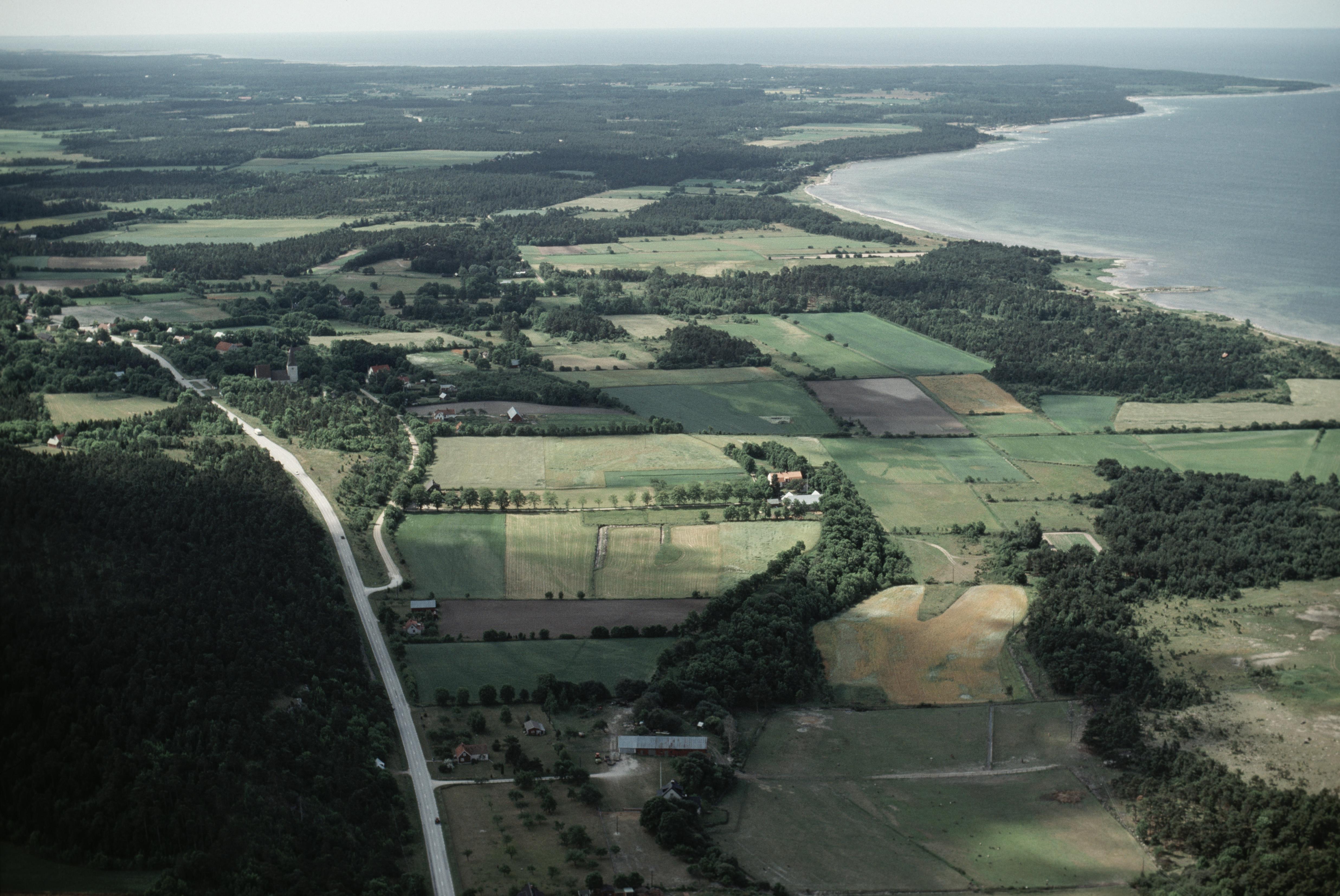 Beskrivning: Fröjels kyrka och kyrkby till vänster om bildens mitt. Vid kyrkan kastal (ruin) RAÄnr Fröjel 11:1. Fiskeläget Valbybodar uppe till höger. Skansudd i Eksta socken i bildens övre kant. Bilden är tagen mot (väderstreck): S