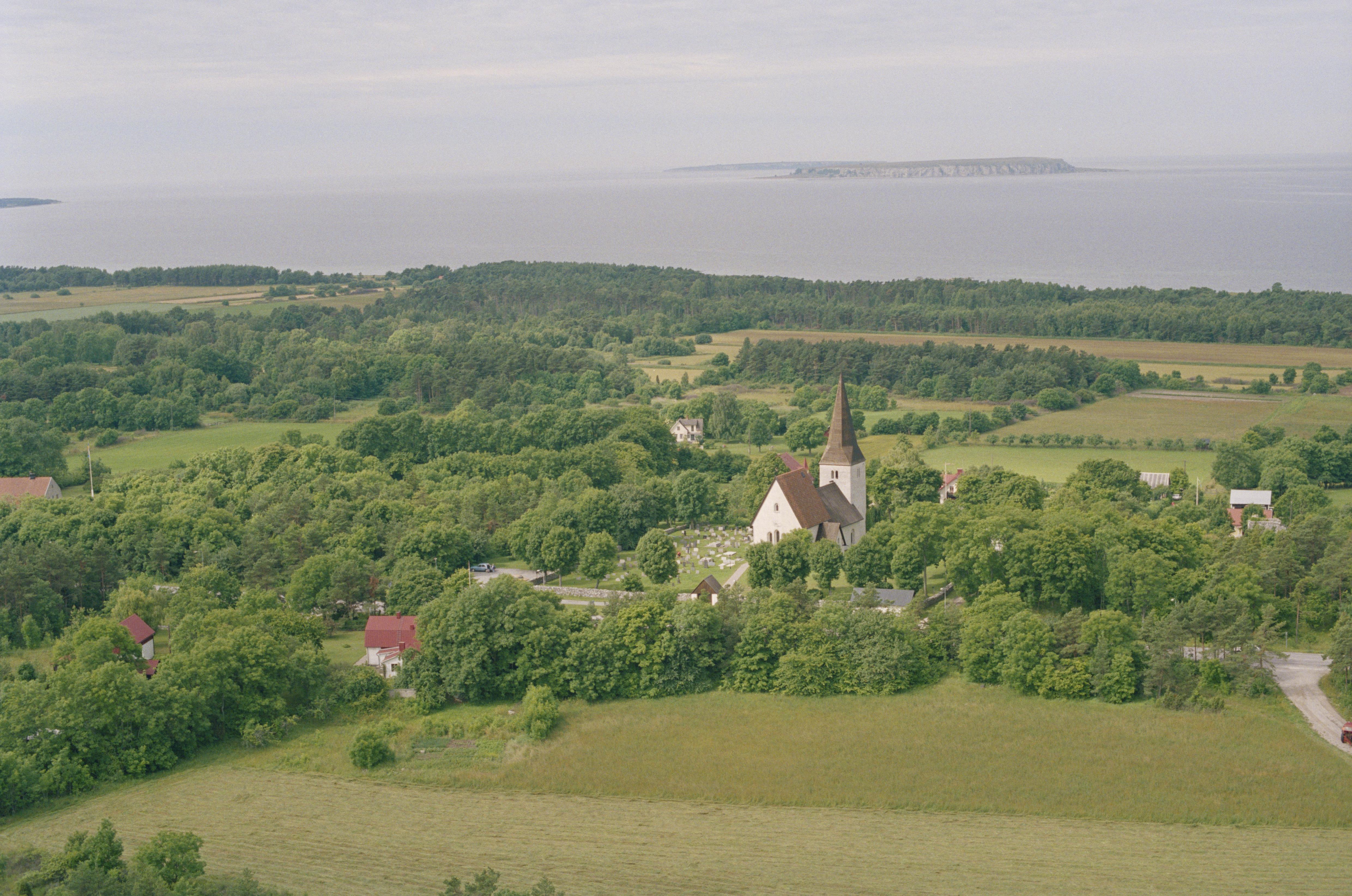 Beskrivning: Fröjels kyrka och kyrkby. Vid kyrkan kastal (ruin) RAÄnr Fröjel 11:1. Lilla Karlsö till höger i bildens övre del. Bilden är tagen mot (väderstreck): VSV