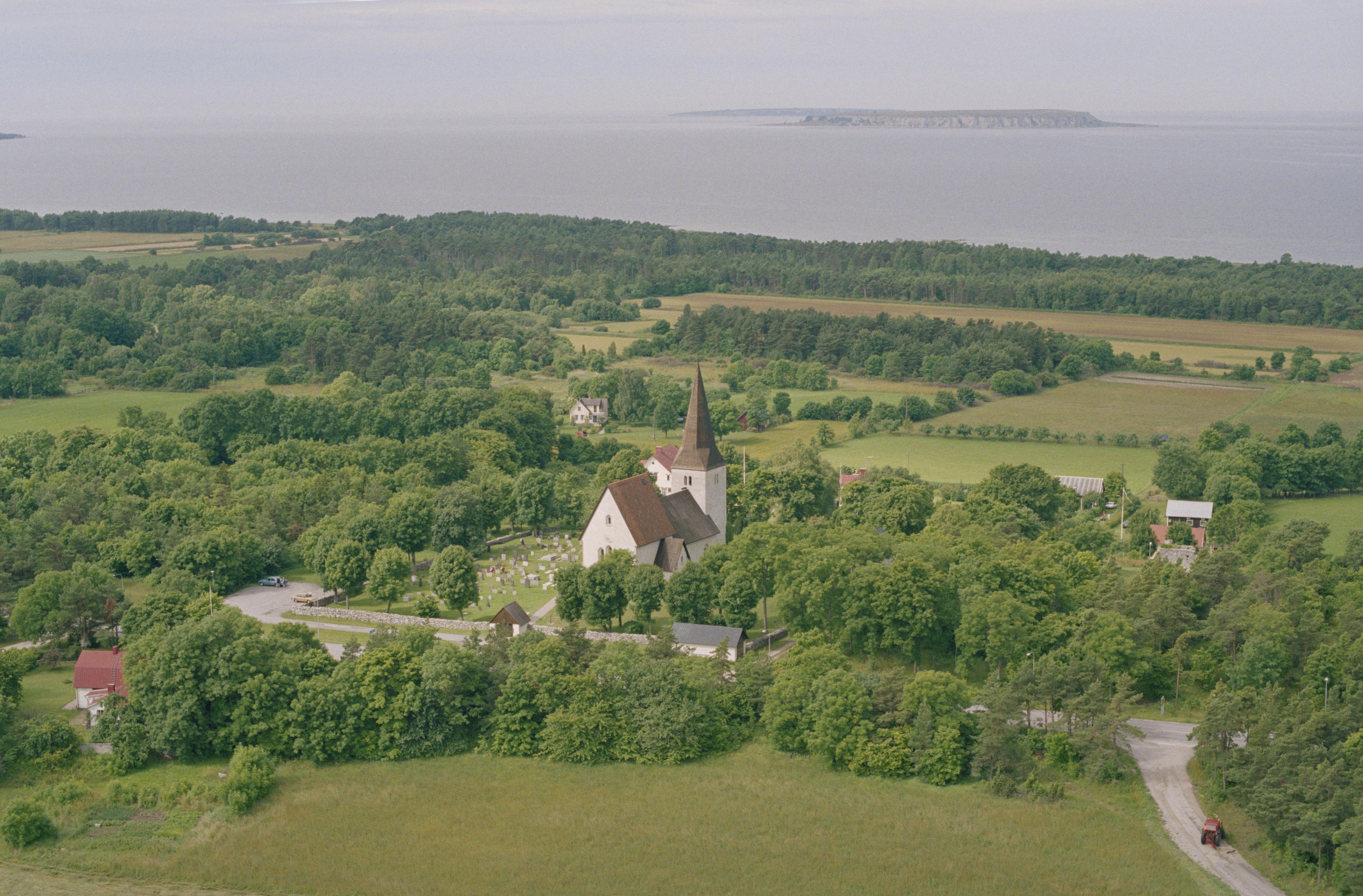 Beskrivning: Fröjels kyrka och kyrkby. Vid kyrkan kastal (ruin) RAÄnr Fröjel 11:1. Lilla Karlsö till höger i bildens övre del. Bilden är tagen mot (väderstreck): VSV
