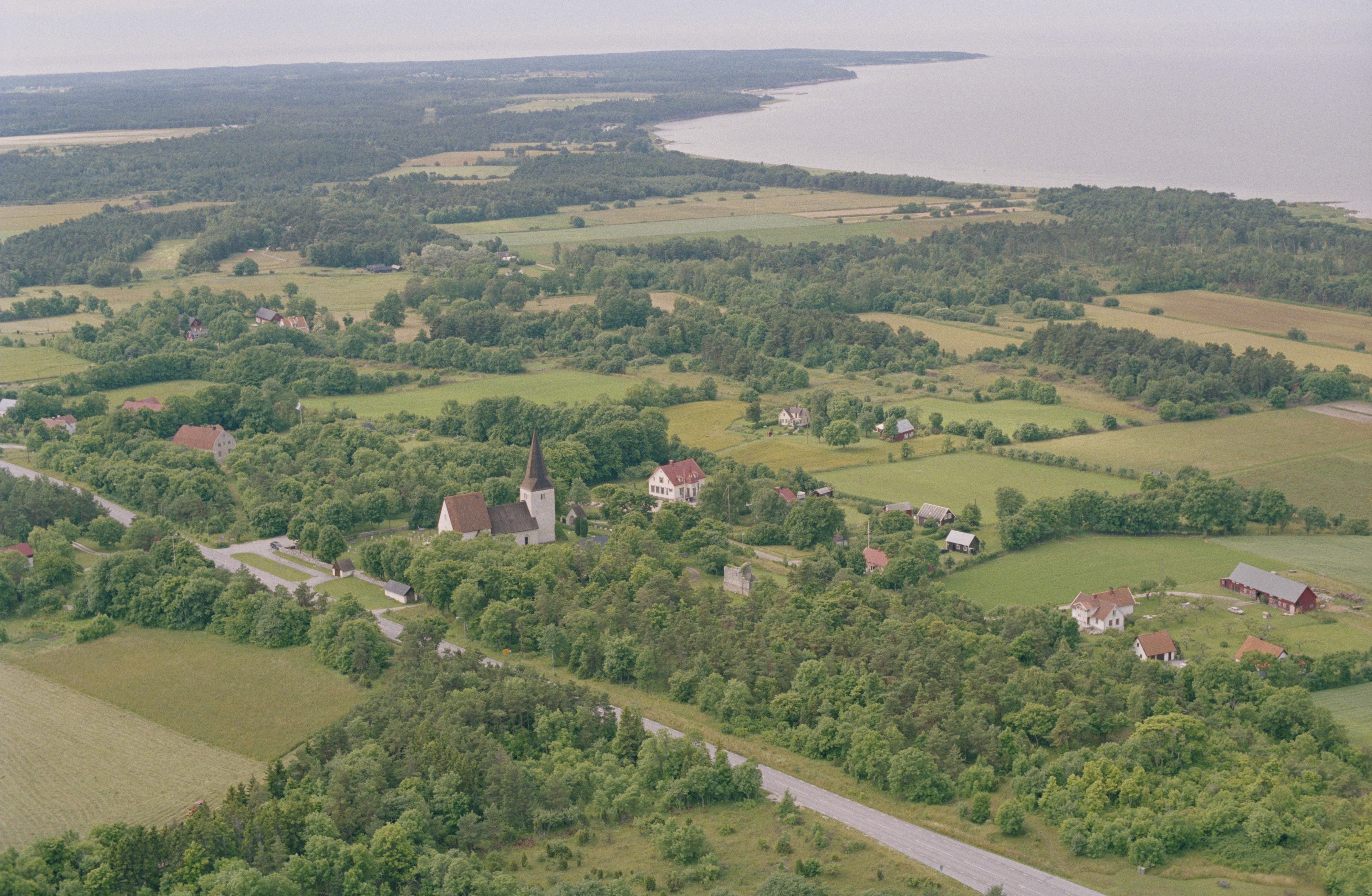 Beskrivning: Fröjels kyrka och kyrkby vid bildens mitt. Vid kyrkan kastal (ruin) RAÄnr Fröjel 11:1. Skansudd i Eksta socken i bildens övre kant. Bilden är tagen mot (väderstreck): SV