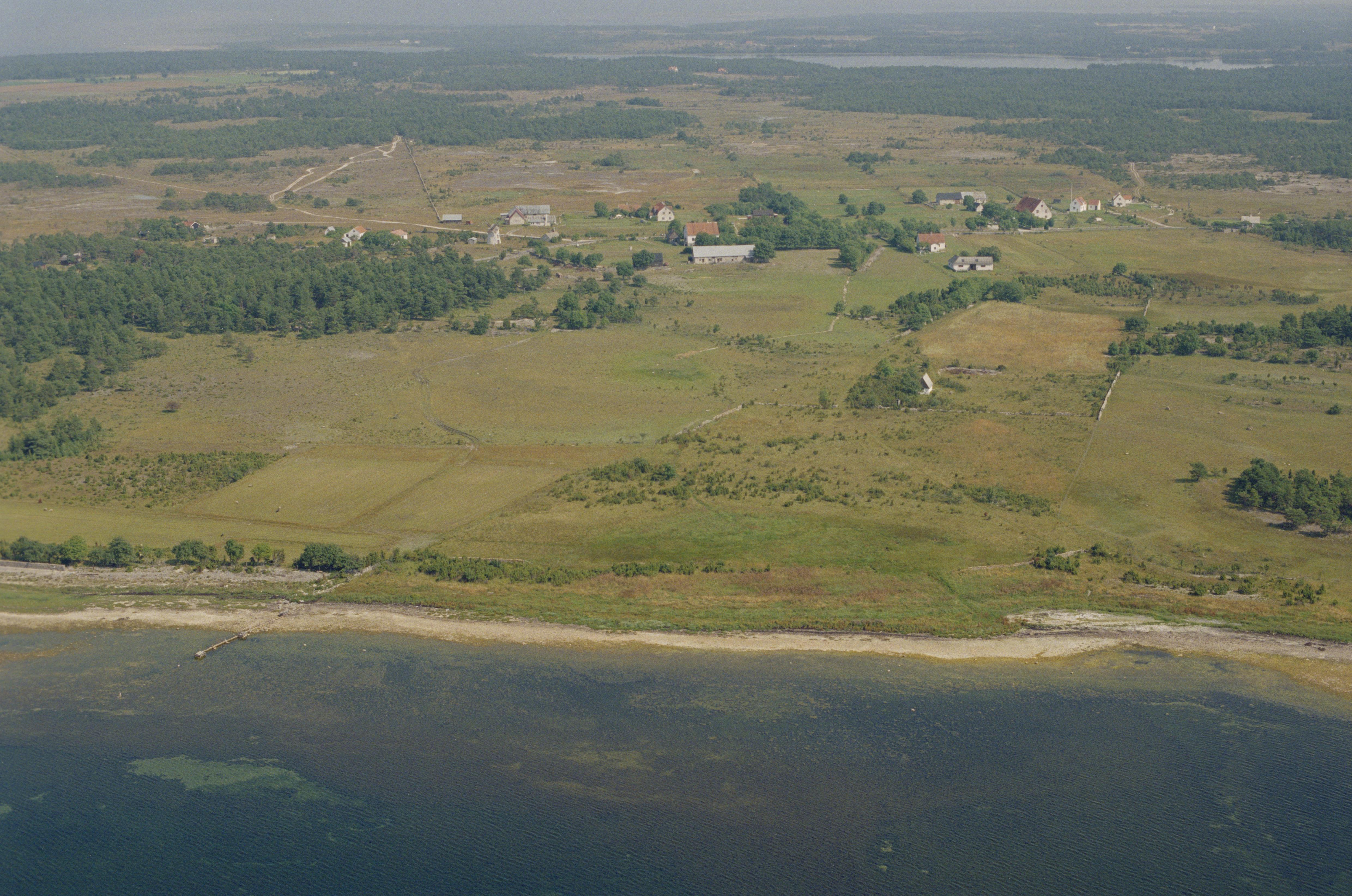 Beskrivning: Lauters by vid Lautervik. I bildens övre del område med skeppssättning och stensättningar RAÄnr Fårö 14:1-3 m.m. Bilden är tagen mot (väderstreck): NO