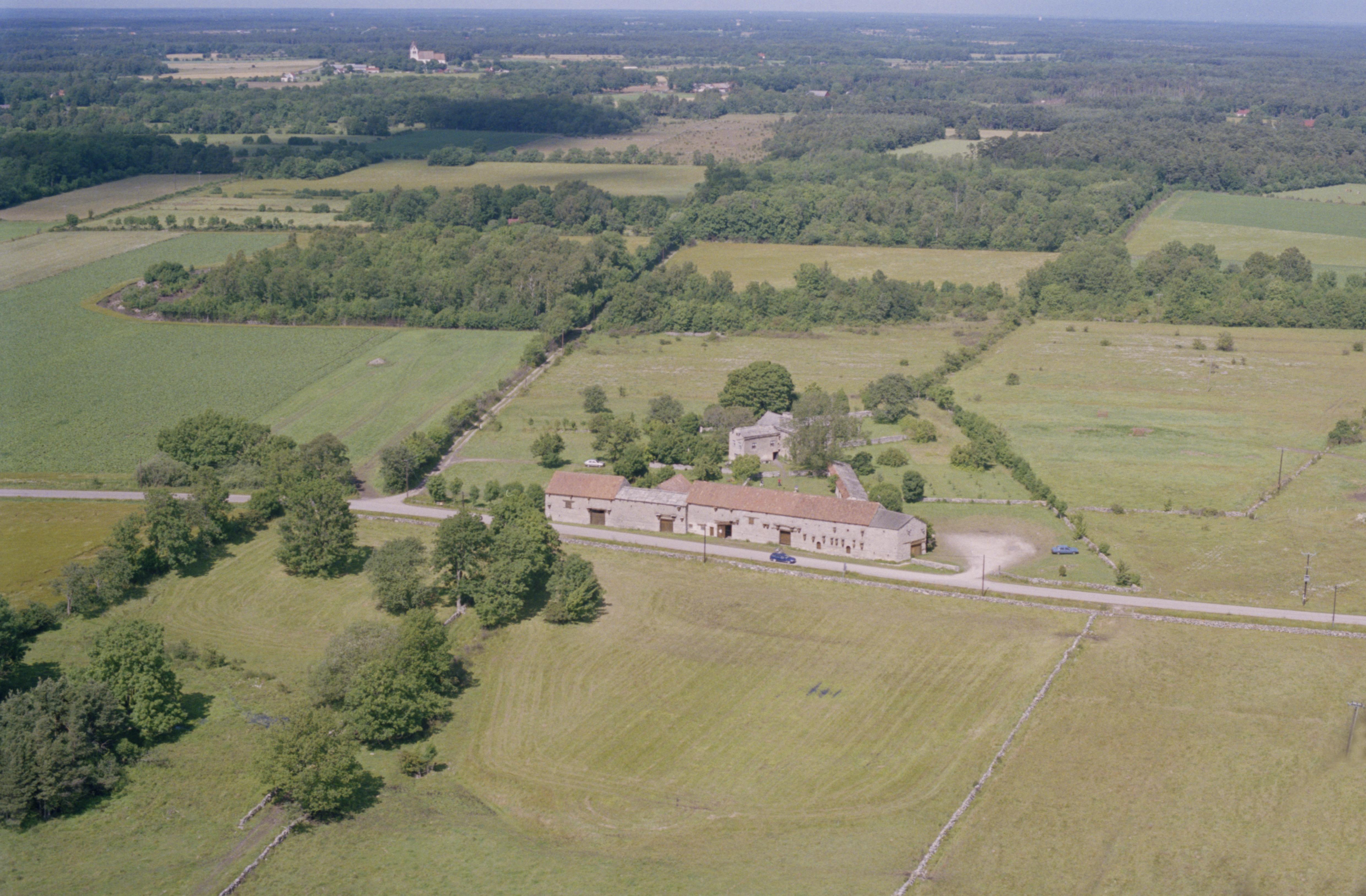 Beskrivning: Kattlunds gård / museigård och byggnadsminne RAÄnr Grötlingbo 55:2. Grötlingbo kyrka till vänster i bildens övre del. Bilden är tagen mot (väderstreck): NNO