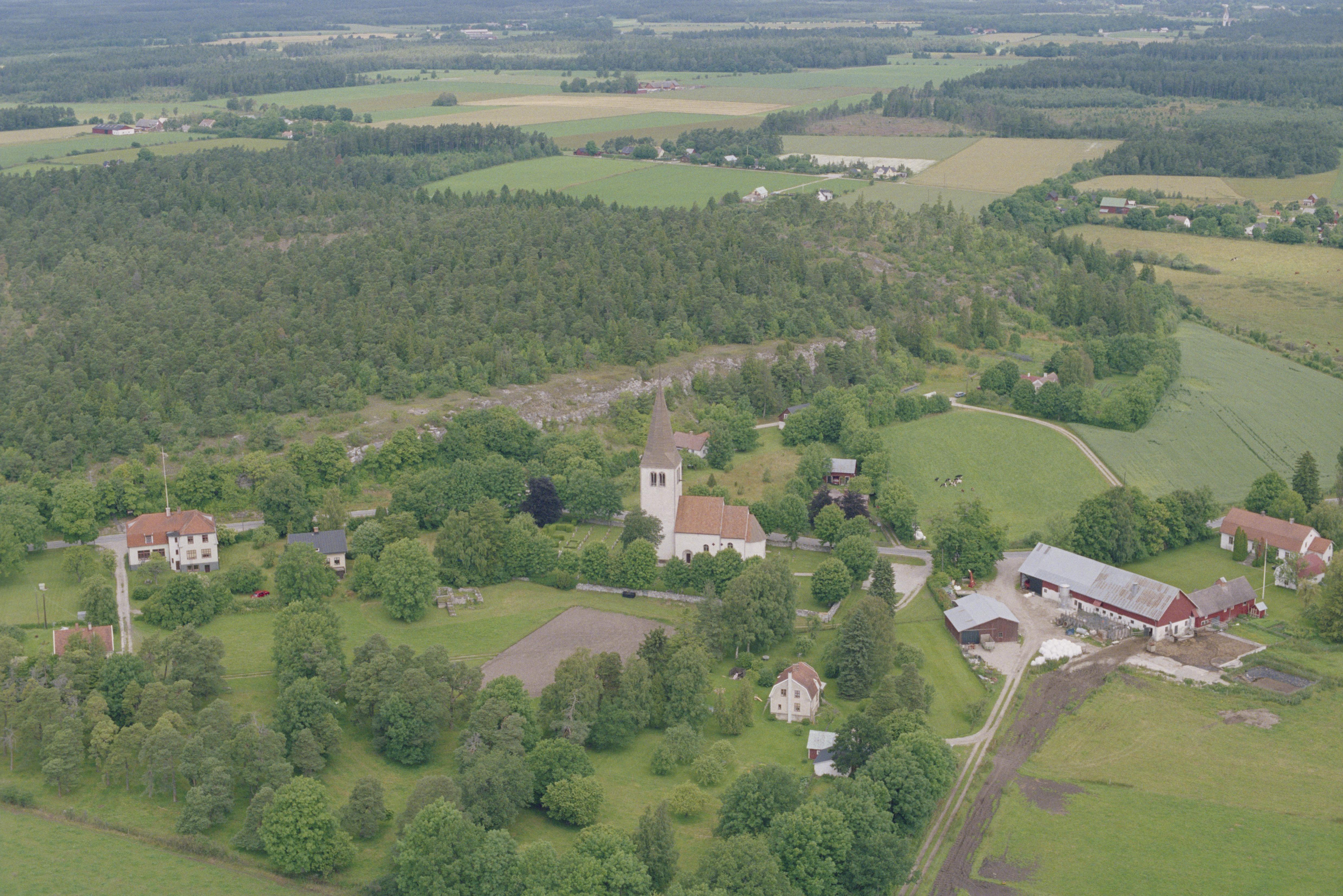 Beskrivning: Linde kyrka och kyrkby. På Lindeberget till vänster i bildens övre del fornborgarna RAÄnr Linde 6:1 (till vänster) och 5:1 (till höger). Lojsta socken i bildens övre kant. Bilden är tagen mot (väderstreck): N