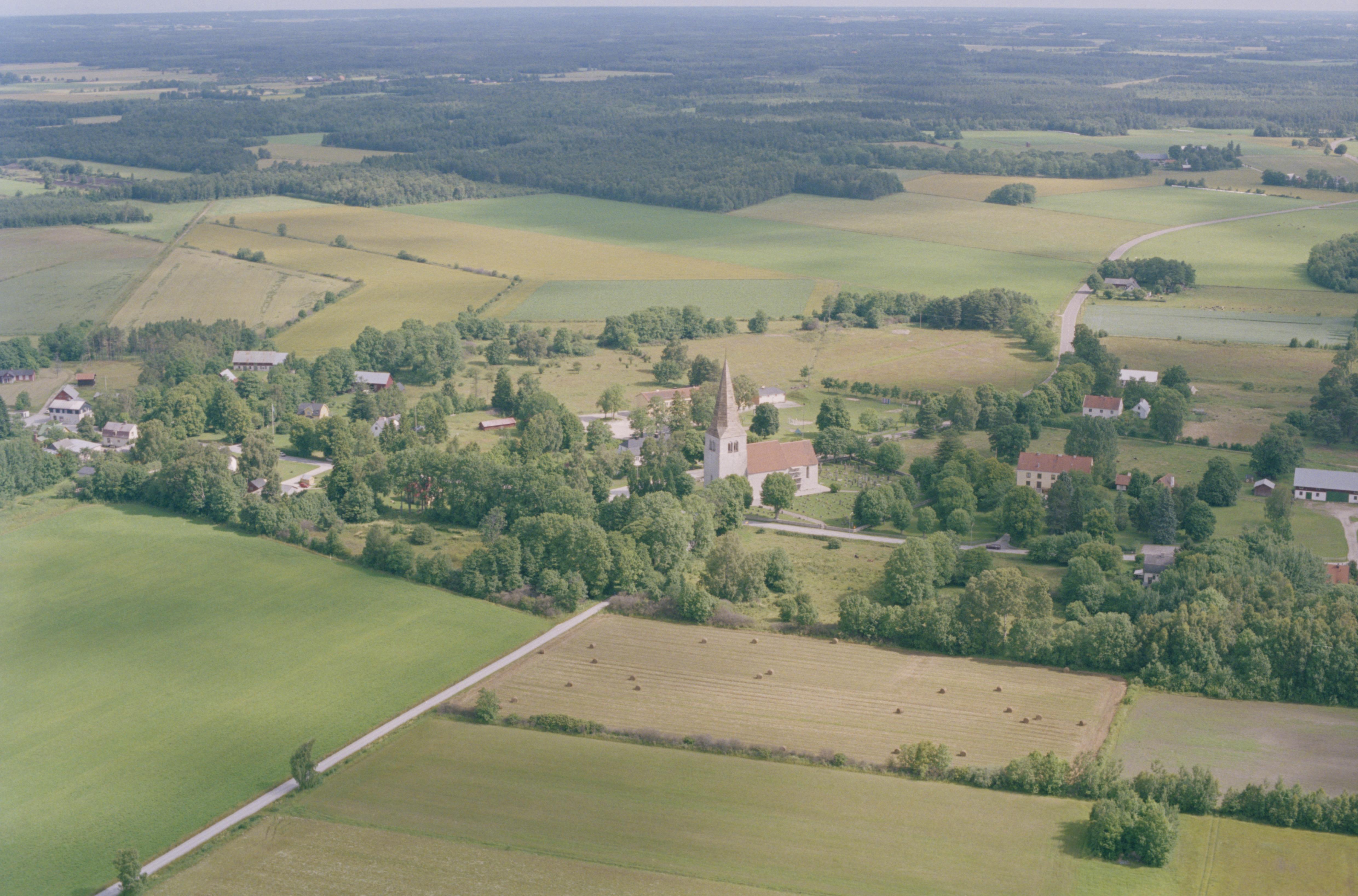 Beskrivning: Sanda kyrka och kyrkby. Vid kyrkan husgrund RAÄnr Sanda 73:1. Bilden är tagen mot (väderstreck): NNO