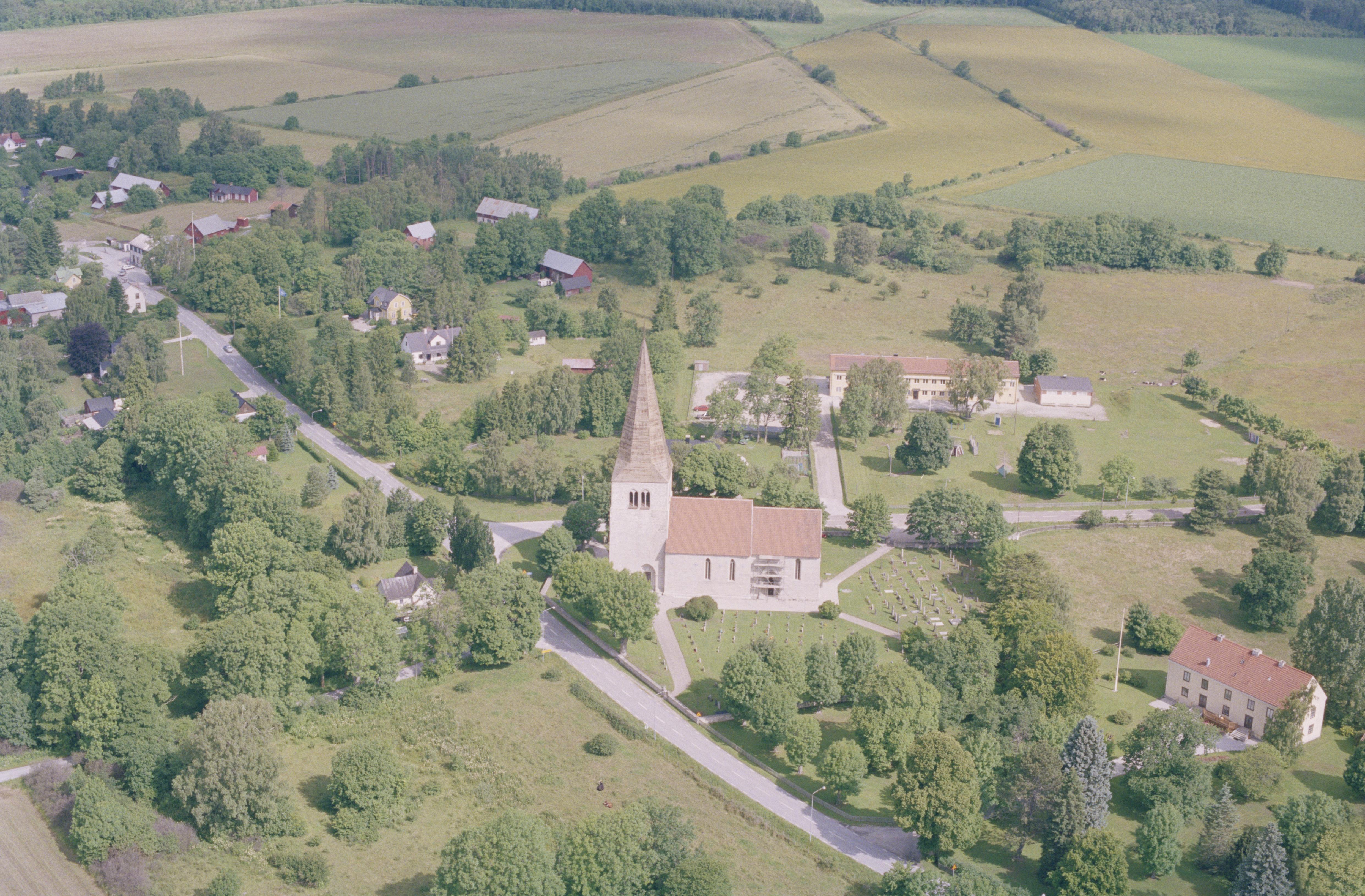 Beskrivning: Sanda kyrka och kyrkby. Vid kyrkan husgrund RAÄnr Sanda 73:1. Bilden är tagen mot (väderstreck): NNV