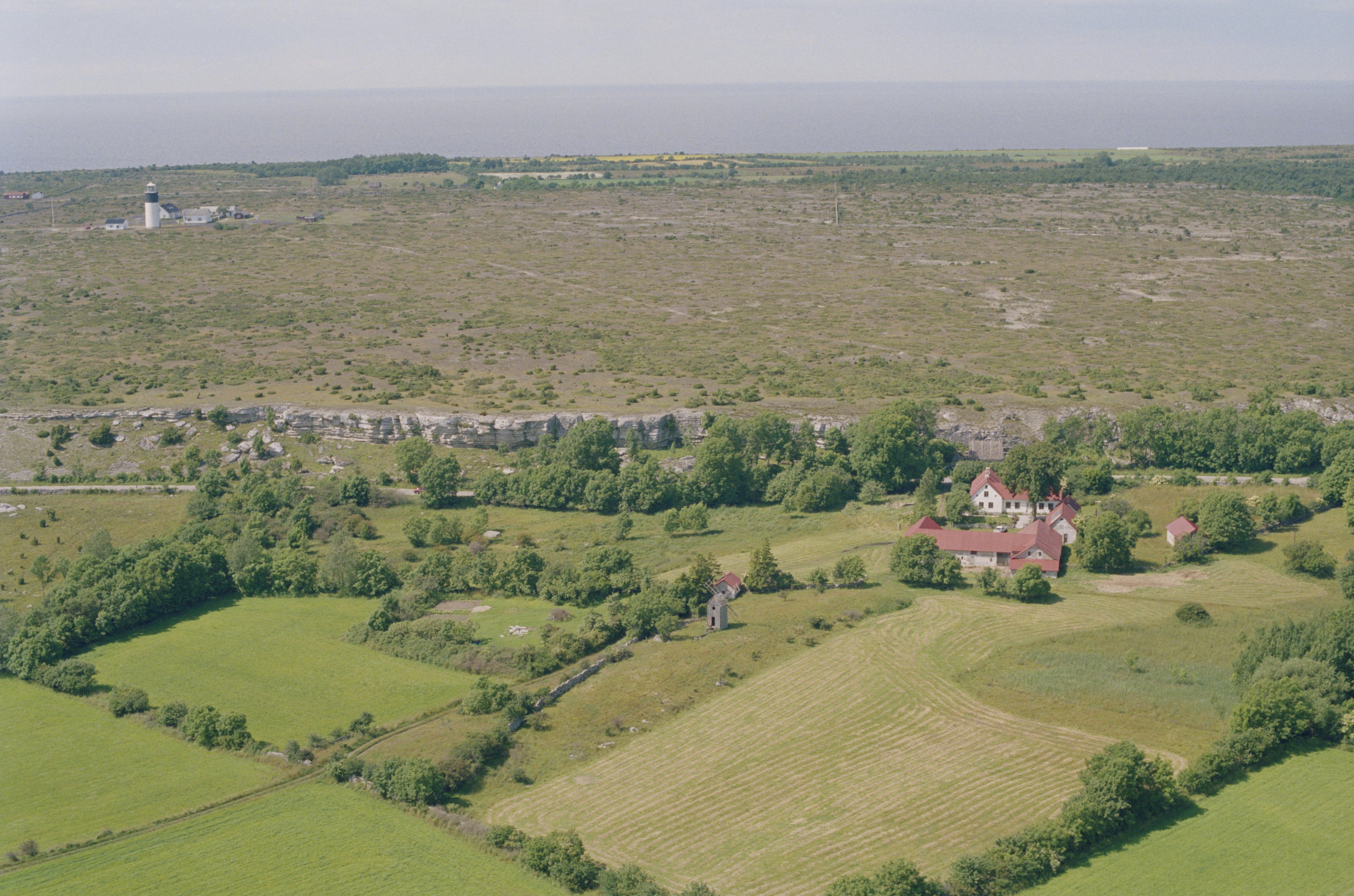 Beskrivning: Till höger Juves gård i Digrans by. Uppe till vänster Hoburgs fyr och fyrplats. Till höger om fyrplatsen stensättningar RAÄnr Sundre 24:1-4. Bilden är tagen mot (väderstreck): VNV
